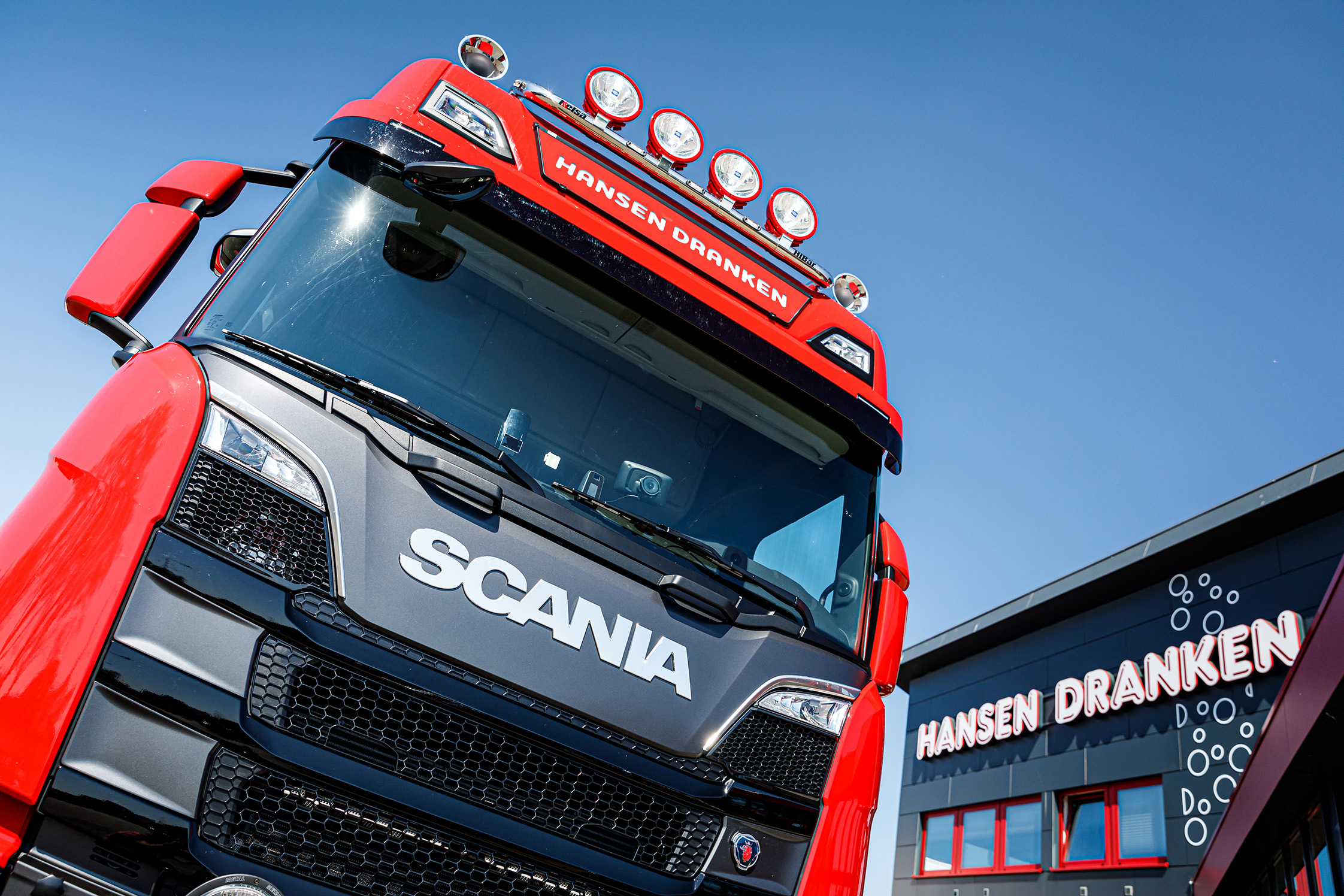 John zijn nieuwe voertuig is ‘een dikke auto’ geworden. “Wij zien een truck als ons visitekaartje. Hij moet uitstraling hebben, maar niet over de top zijn. Dus wij kiezen voor een mooie rode kleur, een wat rijker interieur, voldoende vermogen en altijd een retarder. Maar we hebben weer niet voor de standkoeling of het één meter brede bed gekozen. De chauffeur mag er bij ons binnen een beperkte bandbreedte nog zelf wat aan verfraaien met lampen en zo. Omdat dit een speciale auto is, hebben wij deze keer de auto van twee RVS beugels van Kelsa met ingebouwde witte LED’s en vier Hella Luminators per beugel voorzien. De bovenste hebben we ook in de kleur van de auto laten spuiten. Samen met een setje Hadley’s en een LED-plaat met ‘Hansen Dranken’ er op is hij wat ons betreft af.”