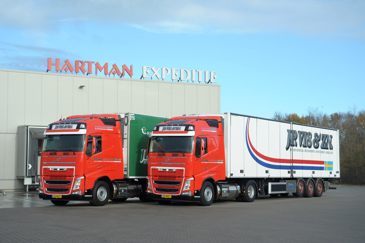 De Hartman Groep heeft onlangs vier Volvo FH 460 Globetrotter LNG-trucks in bedrijf genomen. Twee Volvo’s zijn in de kleuren van Hartman Expeditie uitgevoerd en twee in de kleuren van J.P. Vis & Zn. Met de vier LNG-trekkers zetten deze transportbedrijven een nieuwe stap in de verduurzaming van het wegtransport van en naar Scandinavië.