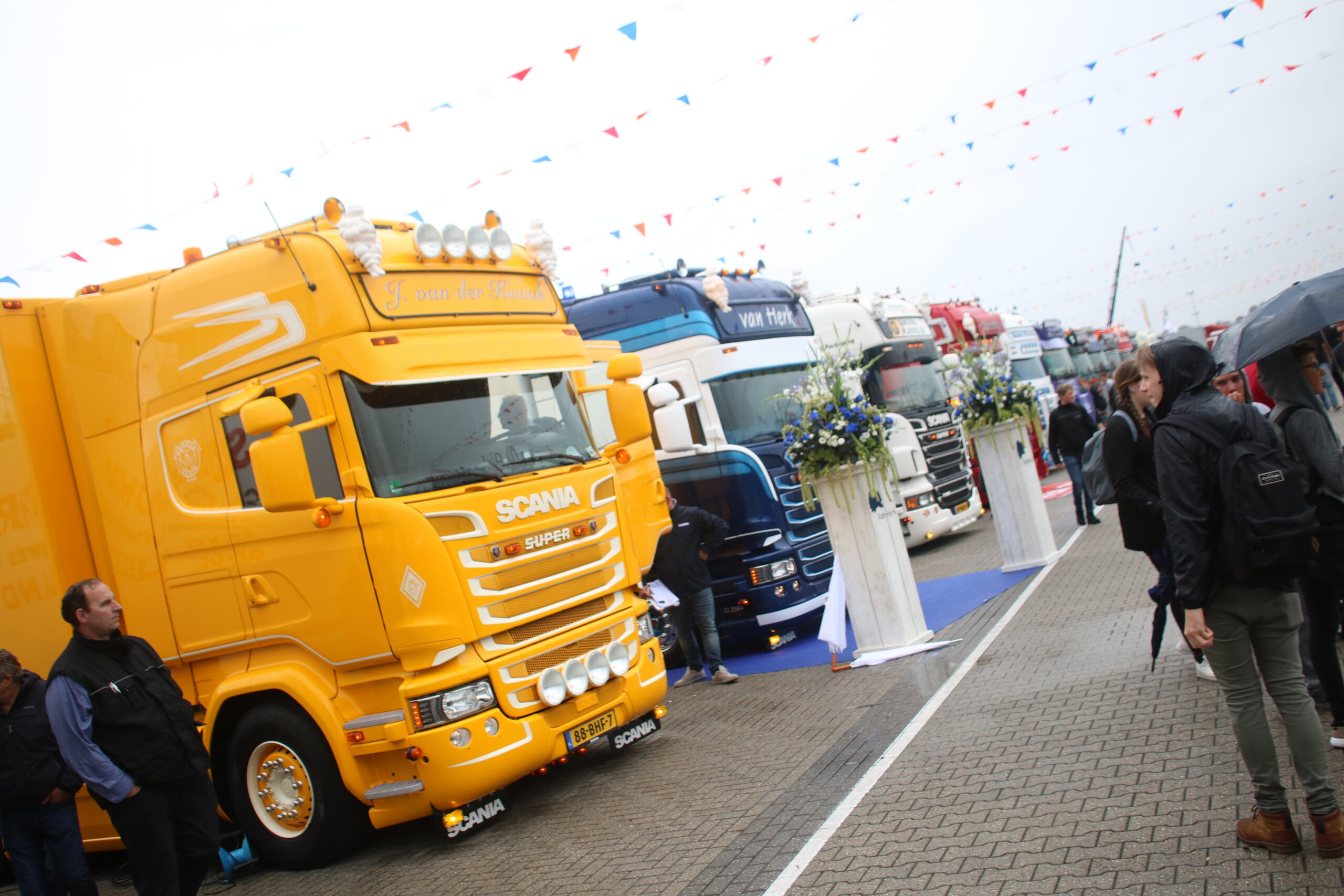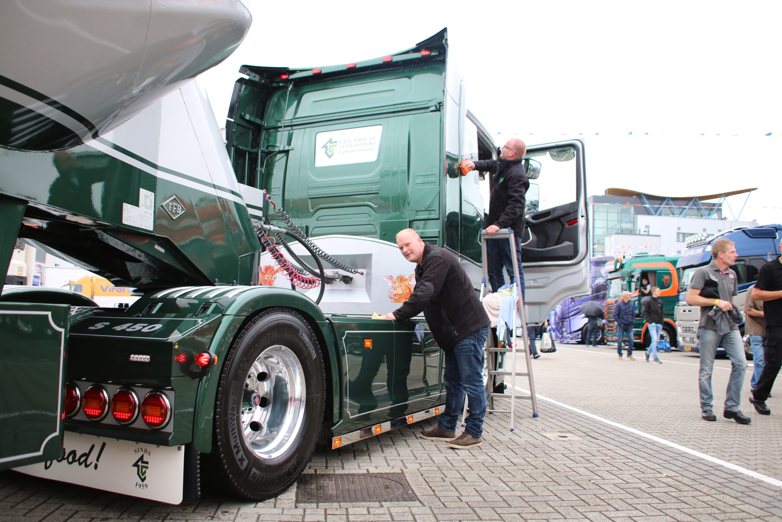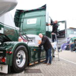 Deelnemers aan de Mooiste Truck Verkiezing speurden vanochtend de dichte lucht boven het Festivalterrein af. De miezer gooide flink roet in hun poetsplannen. Gelukkig is de lucht inmiddels heerlijk blauw en valt er geen druppel meer! ,,Anders blijf je zemen’’, verzucht Dirk de Boer, chauffeur bij Van Triest Veevoeders. Samen met collega Allard Slofstra rijdt hij op één van de vijf prachtig nieuwe Scania S series in de bekende grijs-groene kleurstelling. Zowel in de categorie Bulk- en Tanktransport als in de categorie Losgestort vervoer is Van Triest vertegenwoordigd. ,,Inmiddels rijden we met 30 eigen auto’s en dit zijn onze visitekaartjes naar onze klanten toe’’, legt Rick van Triest uit, de derde generatie binnen het familiebedrijf.