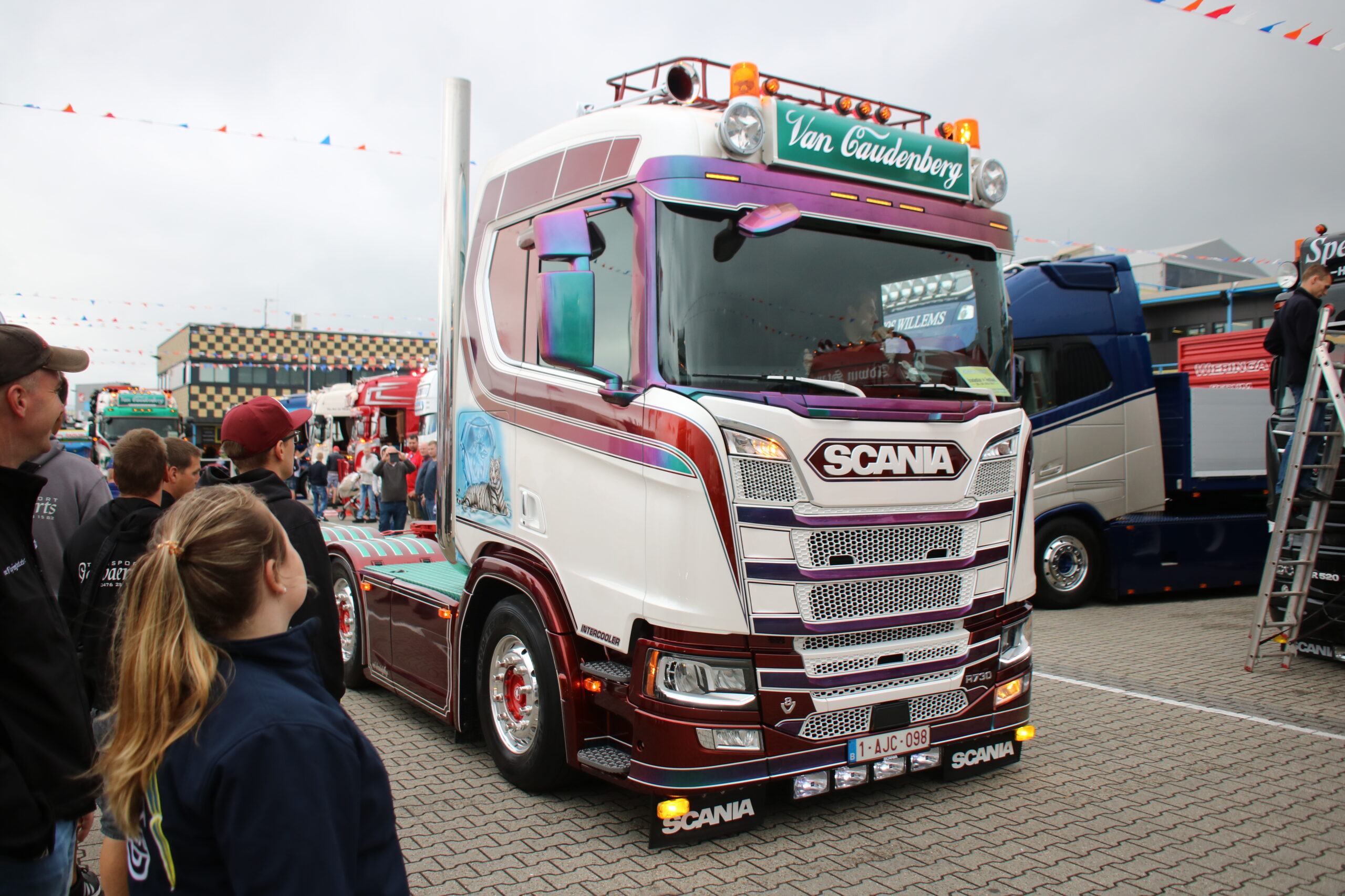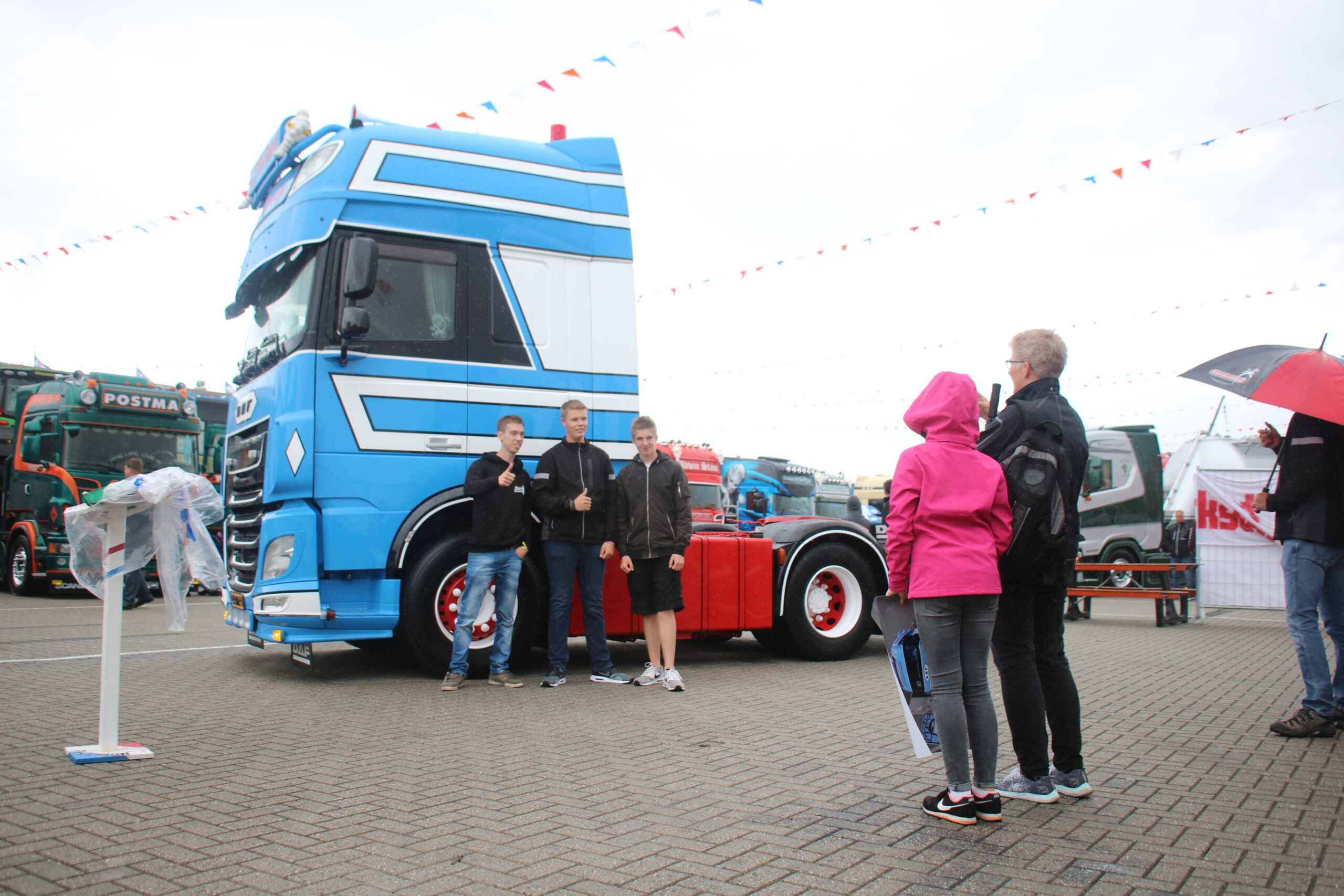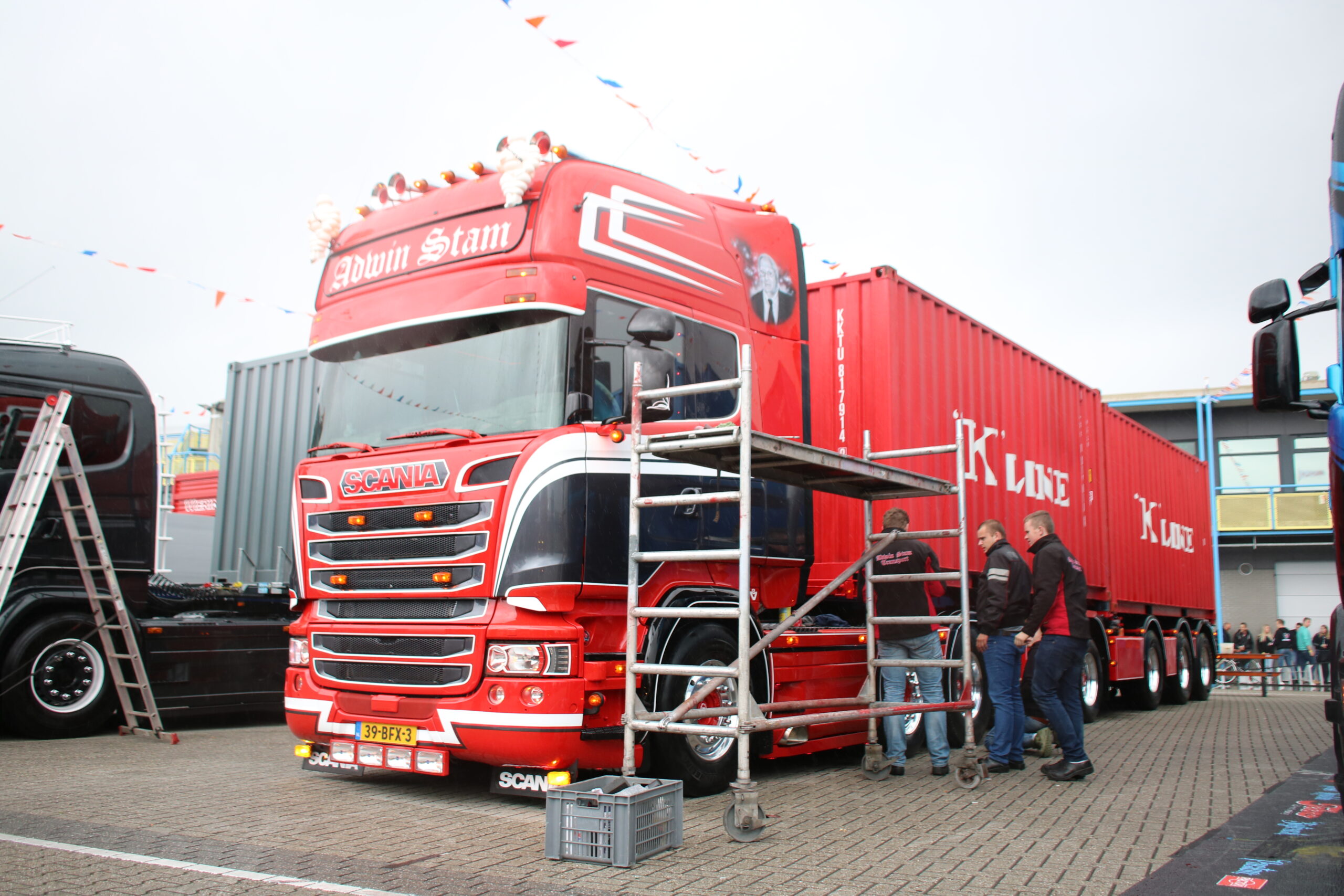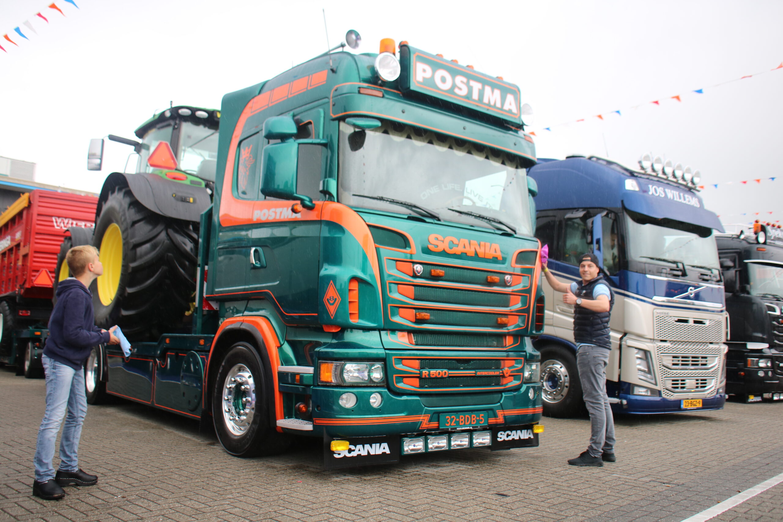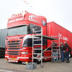 Tegenover de Scania van Grijpskerk staat William de Zeeuw uit ‘s-Gravendeel. Hij legt de laatste hand aan zijn prachtig opvallende DAF XF 460. ,,Ik heb er veel werk aan: ik heb het chassis niet afgedicht en de omstandigheden in Noorwegen zijn niet ideaal voor het netjes houden van de boel’’. Daarnaast wordt William nog regelmatig van zijn werk afgehouden: als YouTube-ster (zie dit filmpje bij Hart van Nederland) is hij een echte BC’er, oftewel een Bekende Chauffeur. Gelukkig heeft hij hulp, onder andere van Edwin van Zwienen. Die staat dit jaar langs de baan, na enkele malen op het binnenterrein te hebben gestaan. ,,Het is allebei leuk, maar langs de baan staan scheelt je echt heel veel werk!’’