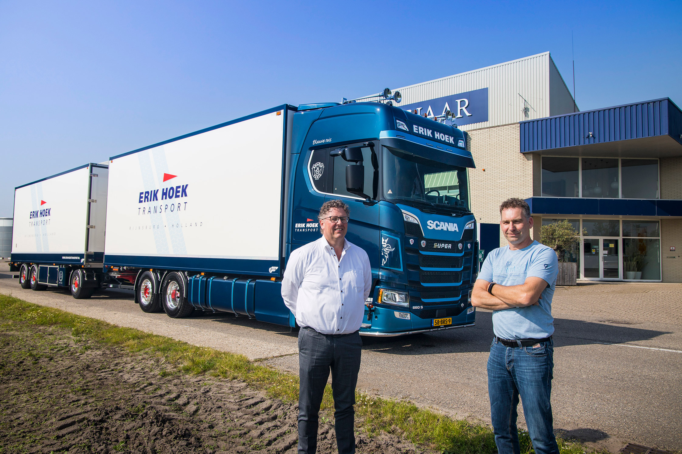 De blauw/witte Scania is met zijn drie-assige aanhangwagen echt nog een klassiek geconfigureerde truck. Erik Hoek: “Wij hebben een uitgesproken voorkeur voor Scania; wij rijden eigenlijk niet anders. Normaal kopen wij geen trucks met S-cabines omdat de instap voor de internationale distributie dan toch wel hoog is. Deze truck is daarop de uitzondering.”