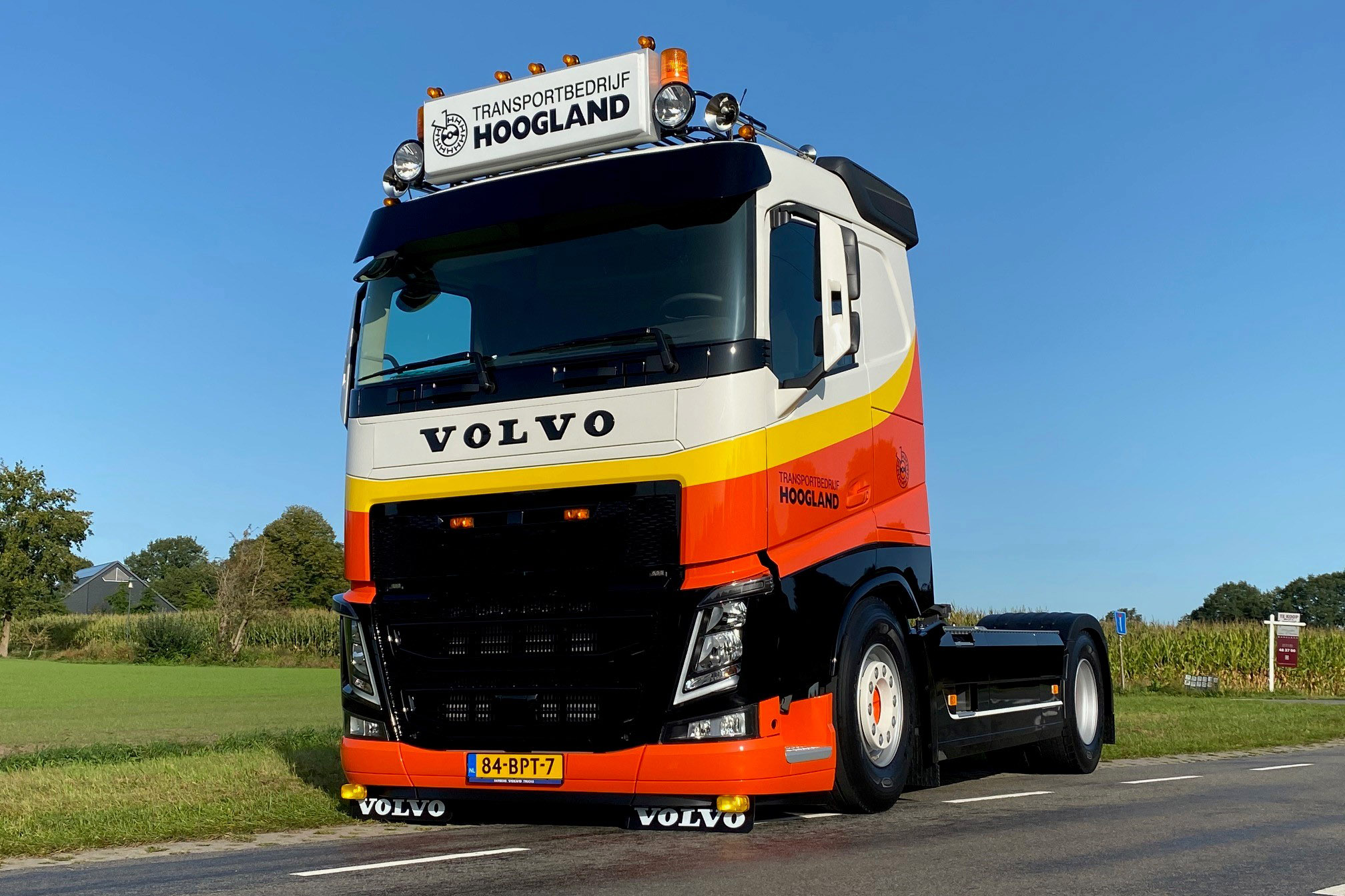 Harbers Trucks Barneveld heeft de FH voorzien van een op maat gemaakte dakrek, oldskool LED lichtbak, deense dagrijlampen, zwaailampen en F12 toplichten. Hoogland Transport wilde het wel functioneel houden en koos voor zijskirts af fabriek. En liet daarachter een grote RVS kist monteren. Een aluminium traanplaat over het chassis maakt het geheel af. Het spuitwerk en de reclame is verzorgd door van Winkoop Truckspuiterij in Ermelo.