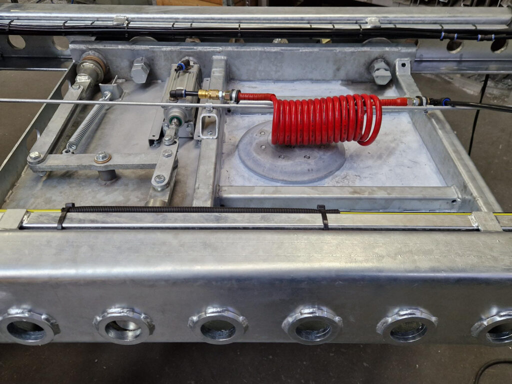 De oplegger is gebouwd op een gegalvaniseerd stalen chassis met een aluminium opbouw en bovendek. Dankzij een slimme constructie kan de kingpin eenvoudig versteld worden, waardoor de totale lengte van de combinatie naar behoefte tot 120 cm verstelbaar is. Die constructie werkt met gelagerde, stalen rollen en met een pneumatische vergrendeling.