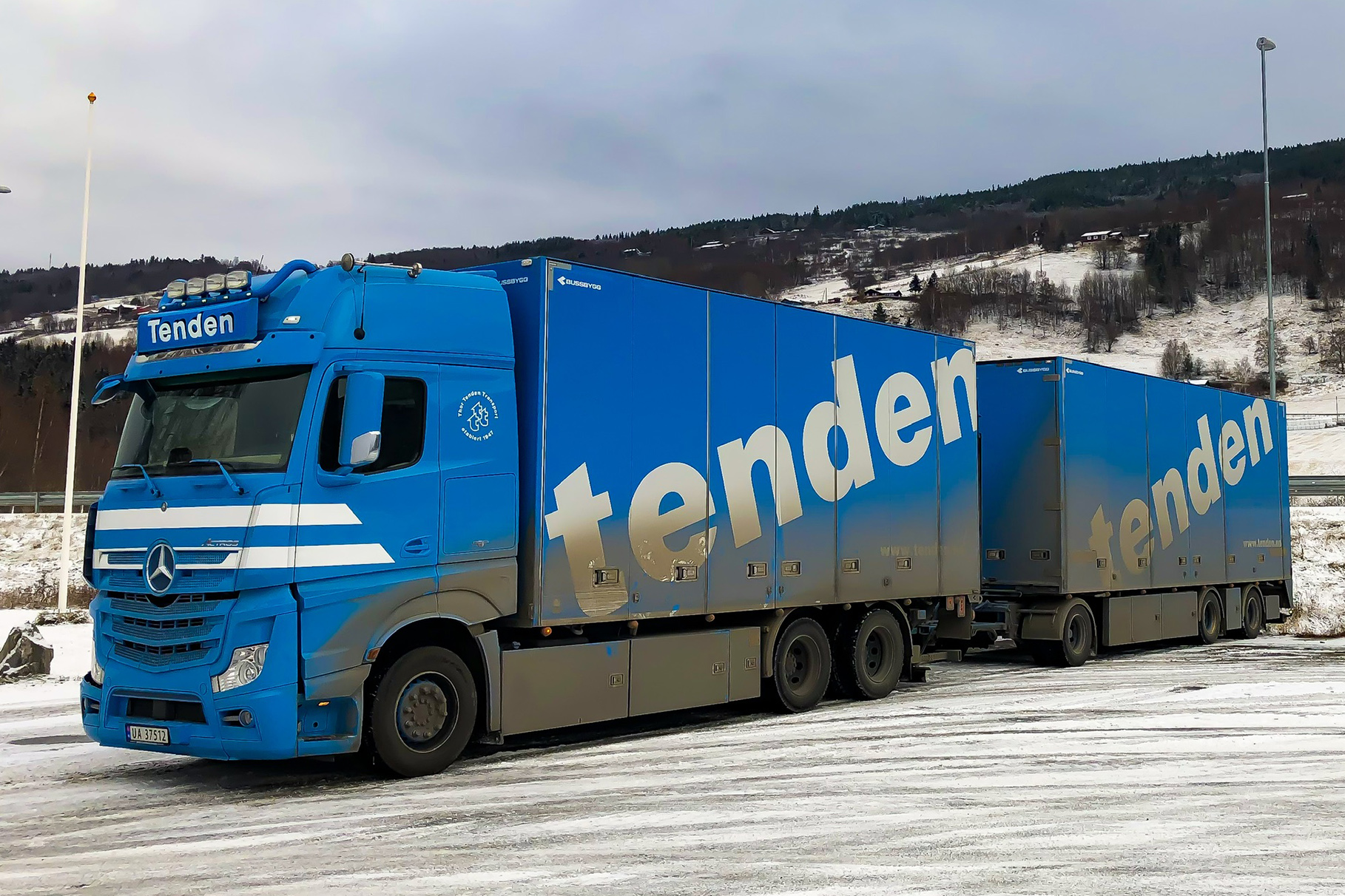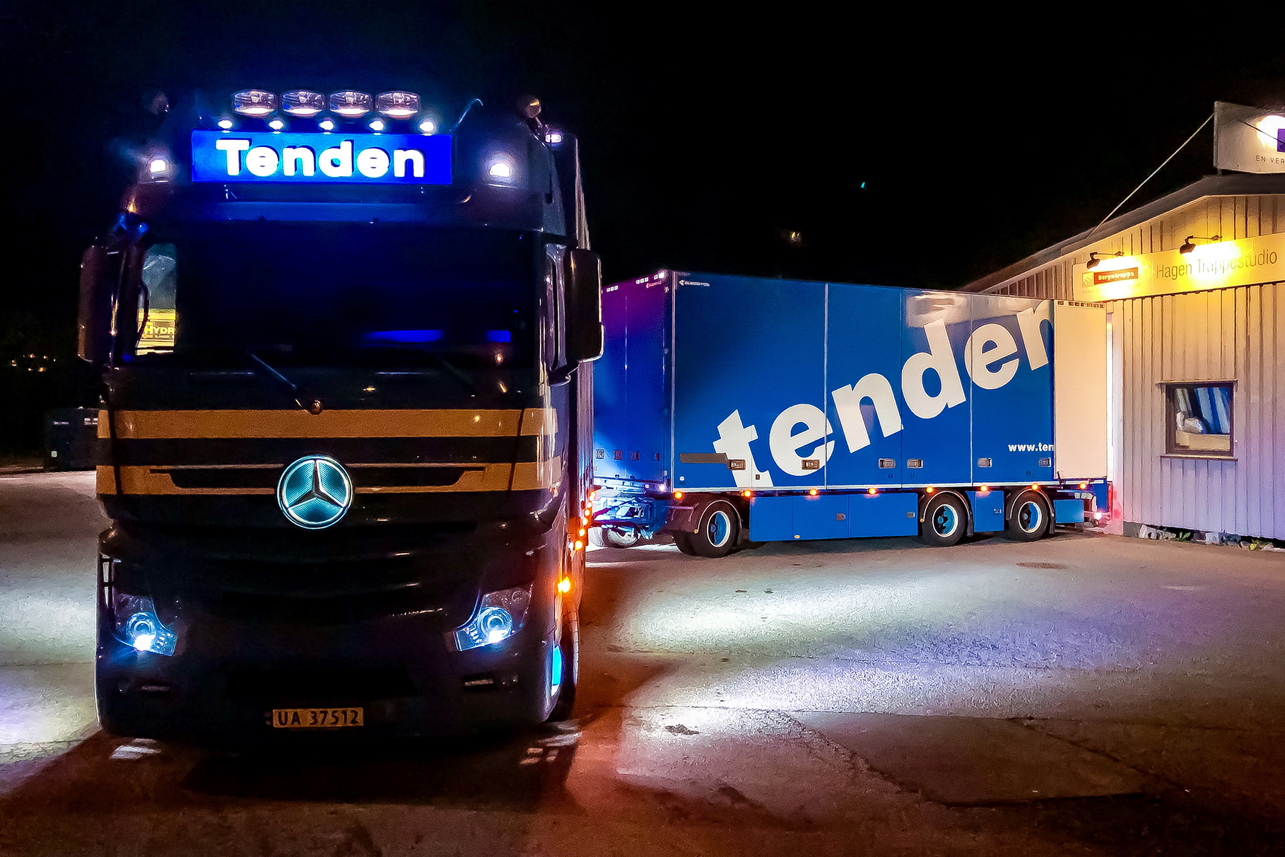 De rit van vandaag begint pas om half vijf ’s middags, maar daar is al bijna een werkdag aan voorafgegaan, omdat het laden veel tijd in beslag nam. Mijn werk voor Tenden bestaat hoofdzakelijk uit het rijden van prefab-trappen voor de firma Hagen. Ik rijd ook veel glaswerk, zoals ramen, kozijnen en deuren, voor grote bouwprojecten en privé-klanten voor de firma Norgesvinduet. Het laden van het glaswerk doe ik meestal samen met een vaste ploeg bij de fabriek, maar het laden van de trappen is voor het grootste deel handwerk en wij bouwen de ritten helemaal zelf op, van begin tot einde. Het zijn behoorlijk wat colli en het laden duurt dan ook gemiddeld een uur of zes. Het laadgewicht varieert van 6.000 tot 10.000 kilogram.