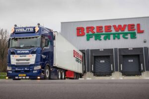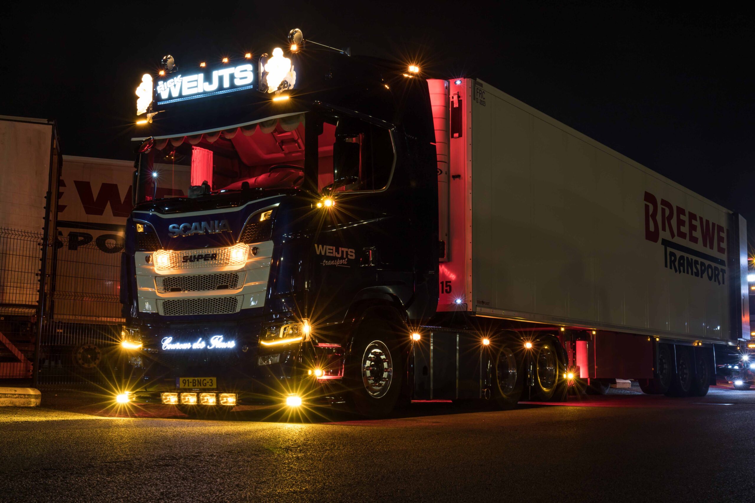 We hebben om 21.00 uur afgesproken bij de overslaghal van Breewel in Hazeldonk. Het is er nog een drukte van jewelste. De ene na de andere combinatie rijdt voor het dok om te laden. De fraaie Scania van Rick Weijts (26) staat al langs de weg te wachten terwijl een andere combinatie van Breewel voor het dok staat om geladen te worden.