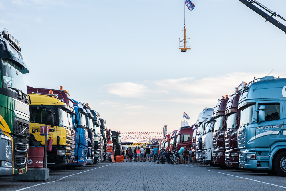 Ondanks de zinderende hitte zit de stemming er al goed in. Veel duimpjes van chauffeurs gaan omhoog bij het inrijden op het Truckstar-festival. En af en toe een claxon. Alhoewel, af en toe.