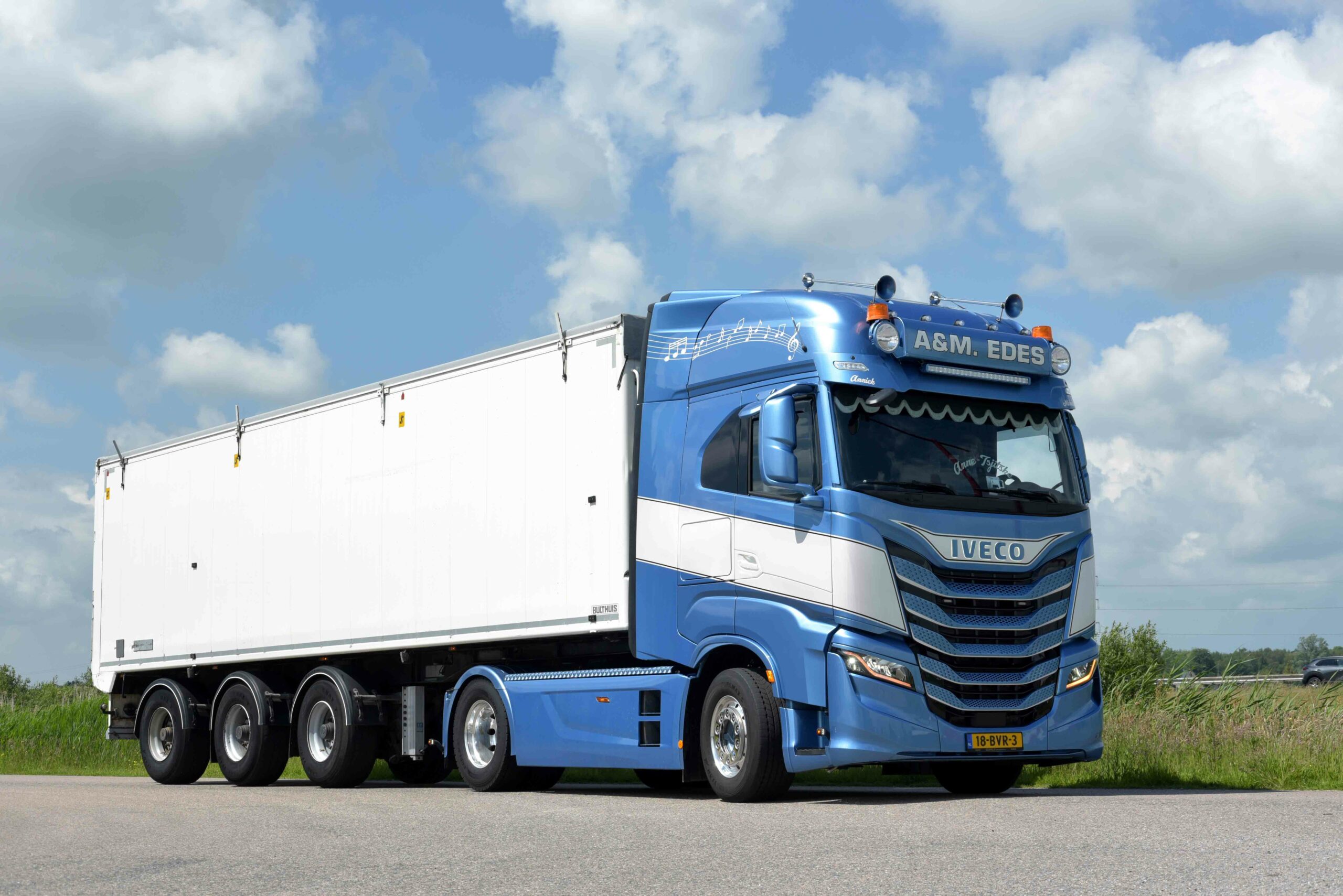 De nieuwe Iveco S-Way is uitgevoerd in een fraaie lichtblauwe metallic lak die af fabriek besteld werd. Spuiterij Van Dis in Hoogezand heeft de truck voorzien van de paarlemoer striping en ook de grille, de zonneklep en de spiegels gespoten. Daarnaast is de truck voorzien van muzieknoten op de zijkanten van het dak als verwijzing naar de zangcarrière van Akkelien. Zij is namelijk elk weekend druk met het zingen op evenementen, waarbij ze met name Engelstalige rocknummers brengt.