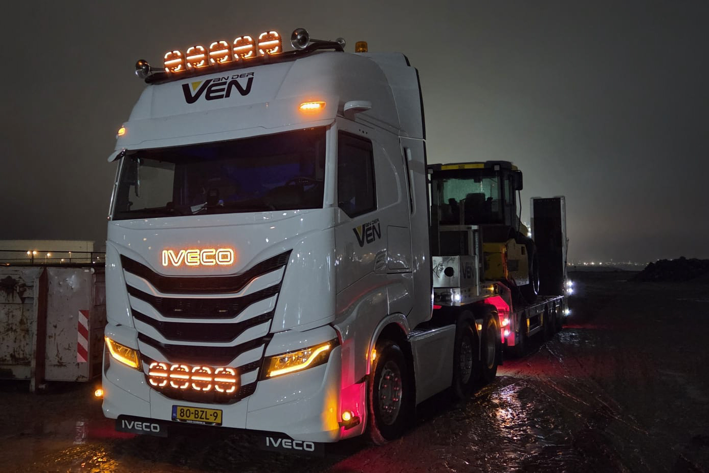 Voordat hij in de vloot van Van der Ven kwam, ruilde de S-Way zijn donkergroene lak in voor de fris witte bedrijfskleur. De trekker was al voorzien van flinke luchthoorns, lampen voor de grille en een verlicht Iveco-logo. Op verzoek van Westerlaken is de lichtbak vervangen door vijf verstralers. Trots zegt hij: “Nu is hij helemaal klaar. Ik ben echt dik tevreden over deze nieuwe Iveco S-Way.”