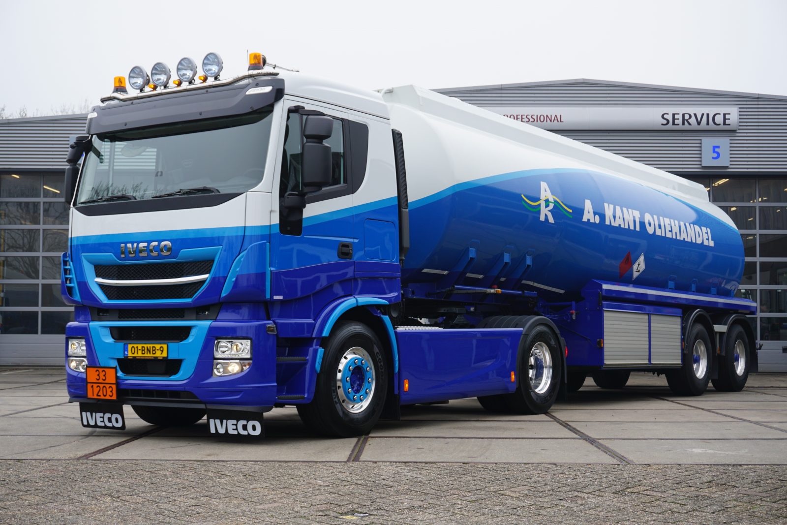 Ad Kant, derde generatie binnen het familiebedrijf ‘A. Kant Oliehandel’ uit Giessen, heeft onlangs samen met zijn vader een nieuwe Iveco Stralis in ontvangst genomen. Deze nieuwe luchtgeveerde trekker heeft een slaapcabine in combinatie met een laag dak, 44 ton treingewicht en een 480 pk cursor 11 dieselmotor. De opbouw is geleverd door Dijssel Soest en het spuitwerk werd verzorgd door Autoschade Herstel Heijstek uit Werkendam.