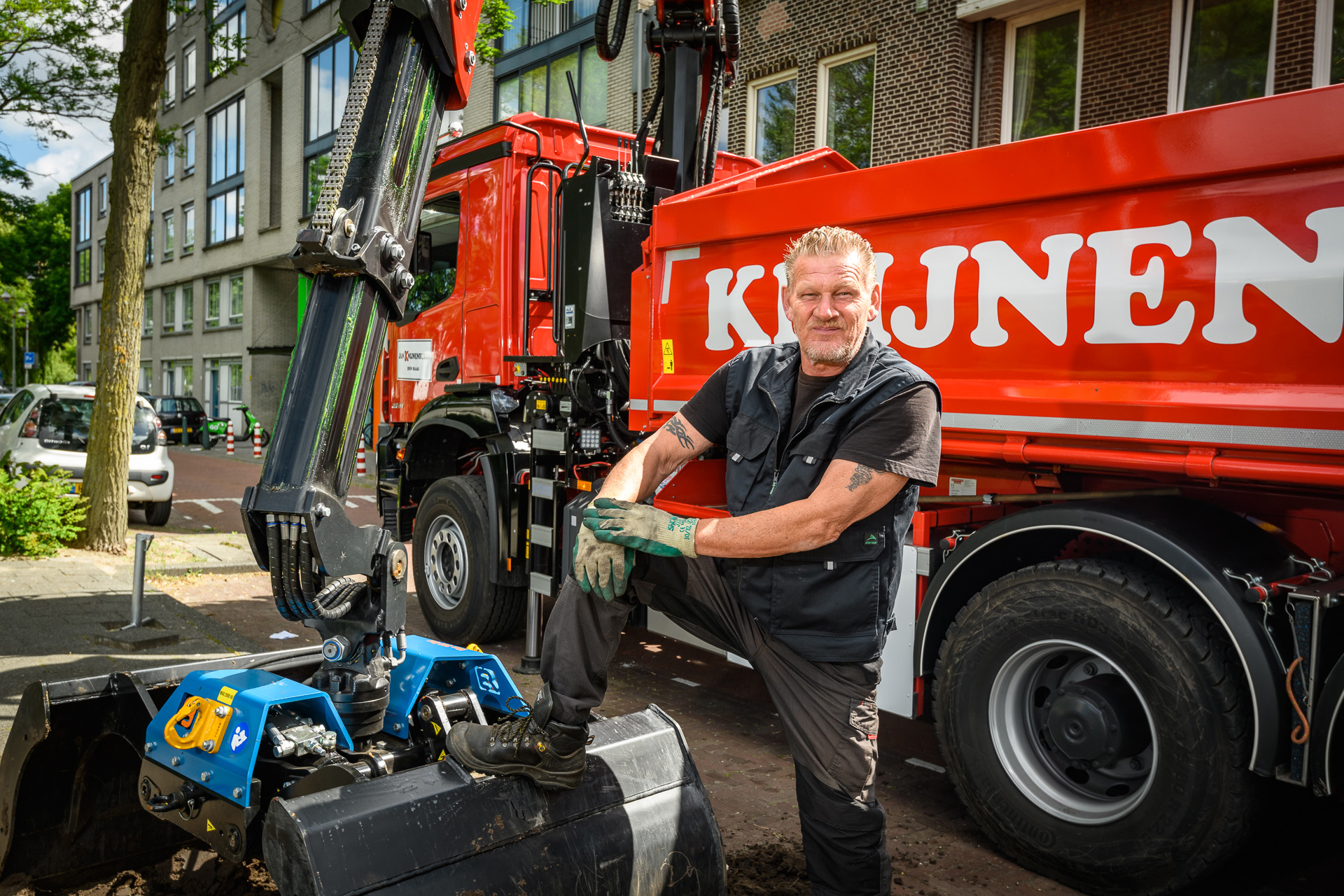 “We hebben voor onszelf strenge doelstellingen geformuleerd op het gebied van duurzaamheid. Qua gebouwen, voertuigen en werkzaamheden kijken we regelmatig hoe we het schoner en beter kunnen doen. Het reduceren van CO2-uitstoot en het voorkomen van geluidshinder zijn belangrijke pijlers in onze plannen. Bij de aanschaf van de nieuwe kippers zijn we ook goed gaan kijken naar de mogelijkheden. Deze Arocssen met e-pto brengen verbetering op veel vlakken: er is geen omgevingshinder door motorgeluid, we stoten niets uit tijdens het gebruik van de kraan en er is geen brandstofverbruik. Missie geslaagd”, vertelt Directeur Geoffrey Knijnenburg.