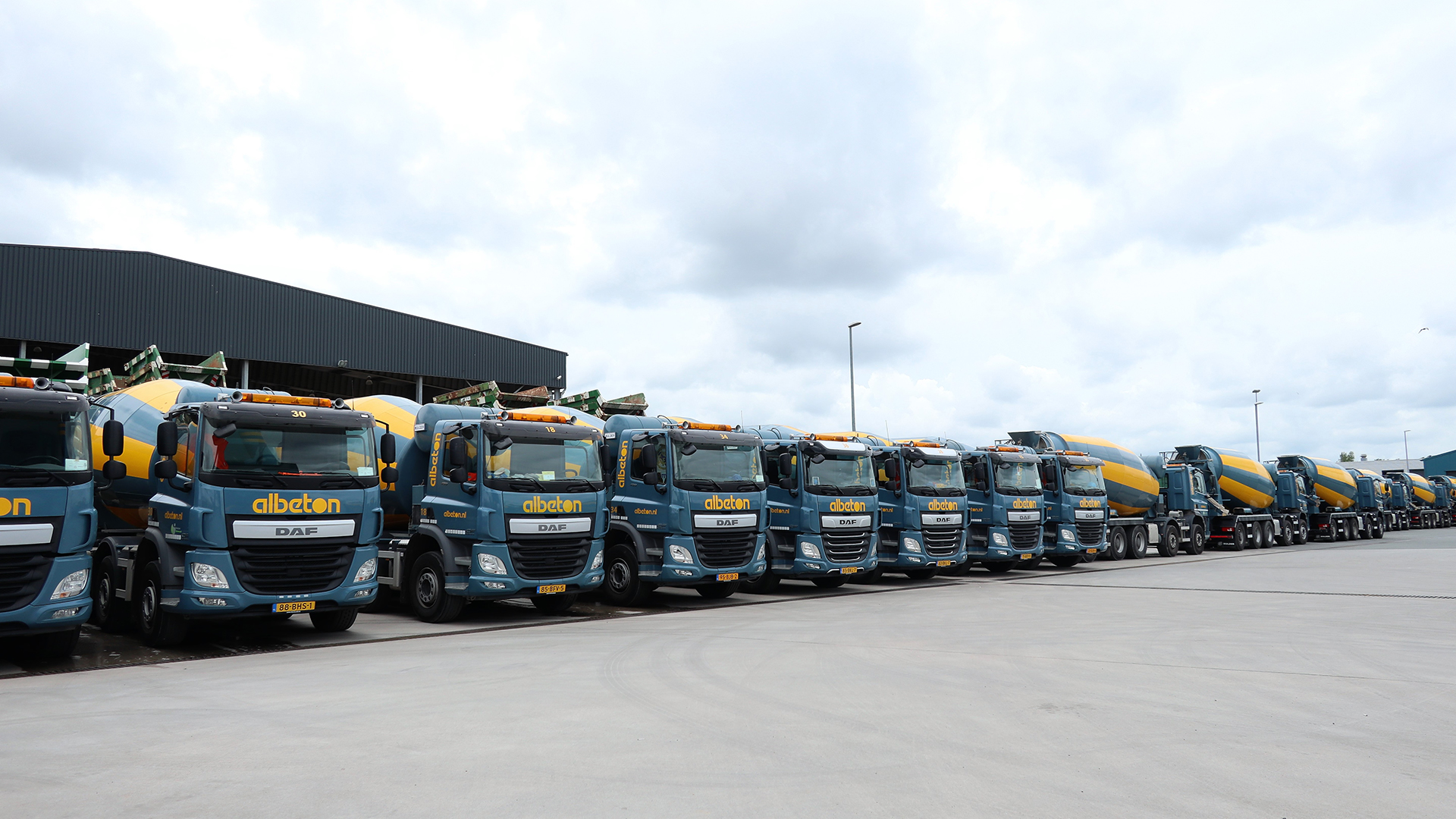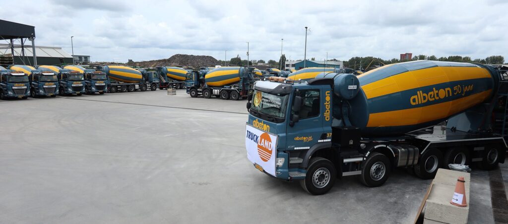 Ter vervanging van bestaande, oudere vrachtauto’s levert Truckland nu meerdere DAF’s, waarvan de vierassige FAD CF’s voorzien zijn van een 410 pk-motor en een 11 m3 Mulder mixeropbouw. De 49 tons versies met vijf assen zijn van het type CF 450 FAD en uitgevoerd met een 15 m3 Mulder mixer. Dit is de vaste mixerleverancier van Albeton. Alleen de kipper en twee pompmixers komen van een ander merk. Een speciale rol binnen het mixerpark is weggelegd voor de elektrische Mulder EcoDrive, die op bouwplaatsen via het stroomnet draait, daarmee wordt het verbruik met 30 procent verminderd, is er geen CO2-uitstoot en wordt er ook geen geluid geproduceerd. Een praktische, maar ook redelijk kostbare oplossing. “Vooralsnog zijn wij de enige die een dergelijke mixer dagelijks onderweg hebben en willen er ook een statement mee maken. Duurzaamheid en milieu spelen immers een grote rol in onze bedrijfsvoering. Zoals gezegd rijden wij binnen afzienbare tijd alleen nog maar met Euro 6 diesels en om de prestaties daarvan optimaal te benutten volgen onze chauffeurs de Code95 cursus ‘Zuinig Rijden’ via Truckland”, legt Jeroen Droog uit.