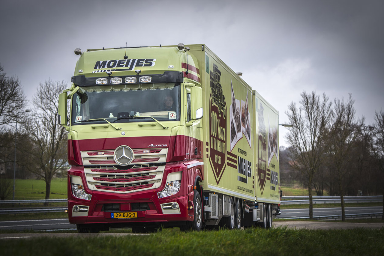 Het is een Mercedes Actros, geleverd door Gomes Trucks, die is voorzien van speciale logo’s vanwege het 100-jarig bestaan en oude foto’s uit de geschiedenis van Moeijes. De bakwagen is gecombineerd met een Fliegl aanhangwagen, TRS Iceland koelmachine en geïsoleerde koelopbouw van SOR Iberica. Trotse chauffeur is Danny Moddermann.