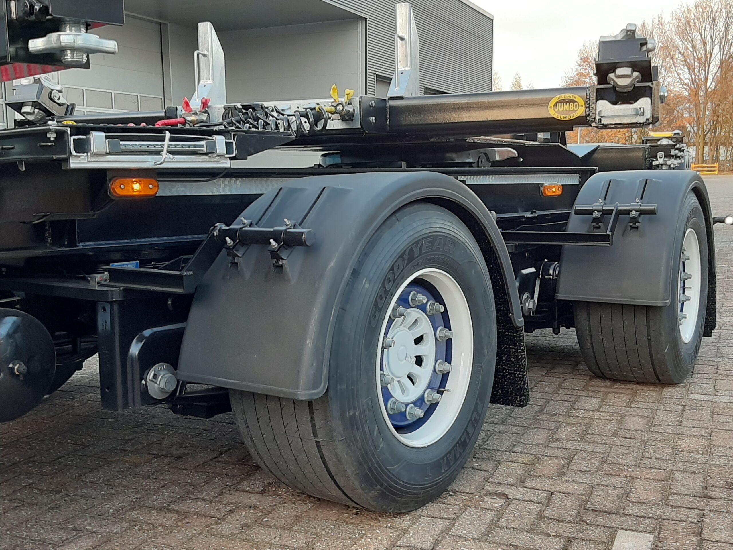 Dit nieuwe Jumbo model is gebaseerd op het bestaande succesnummer met luchtbediende schuiftafel. Groep Jumbo Groenewegen heeft samen met Tridec een stuursysteem ontwikkeld dat de achterste 2 assen van het LZV tussenstuk in de juiste stand kan brengen zodat de hele LZV-combinatie met een gewoon star volgchassis de ‘Duitse’ bestreken baan kan halen.