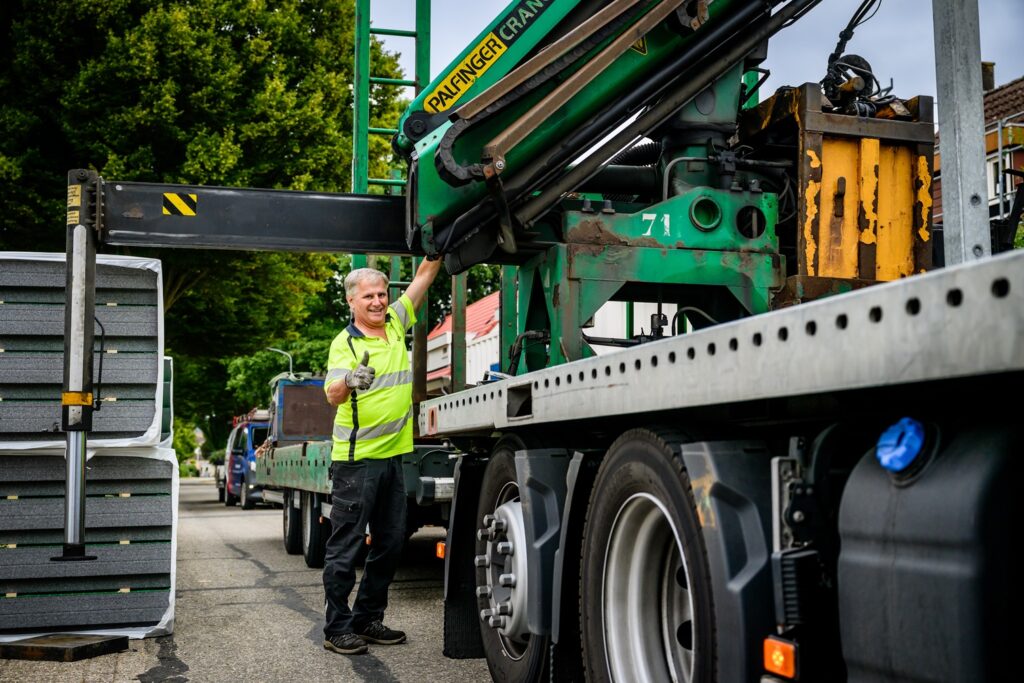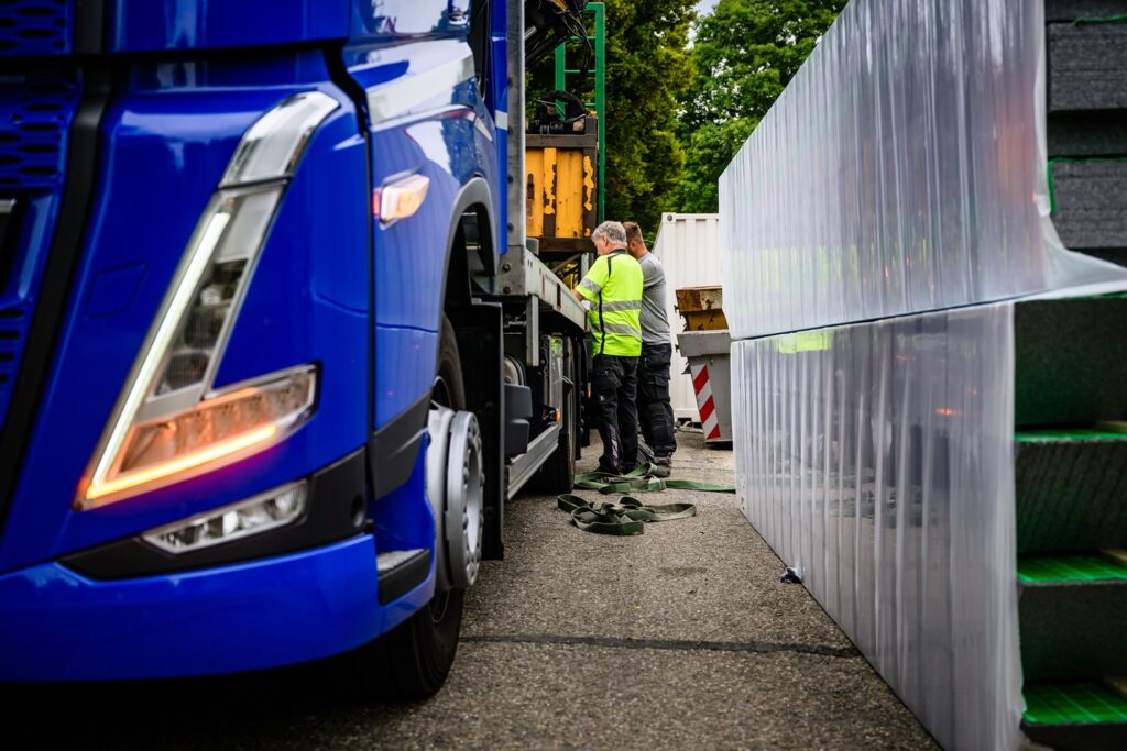 De trucks worden hoofdzakelijk ingezet voor het transport van dakpanelen. “Die worden gelost worden met een autolaadkraan en een speciale klem,” vertelt Peter. “Die klem is een eigen concept, uniek in Europa, die exact op maat is gemaakt voor het laden en lossen onze materialen. Dit maakt deze voertuigen onmisbaar binnen onze werkwijze.”