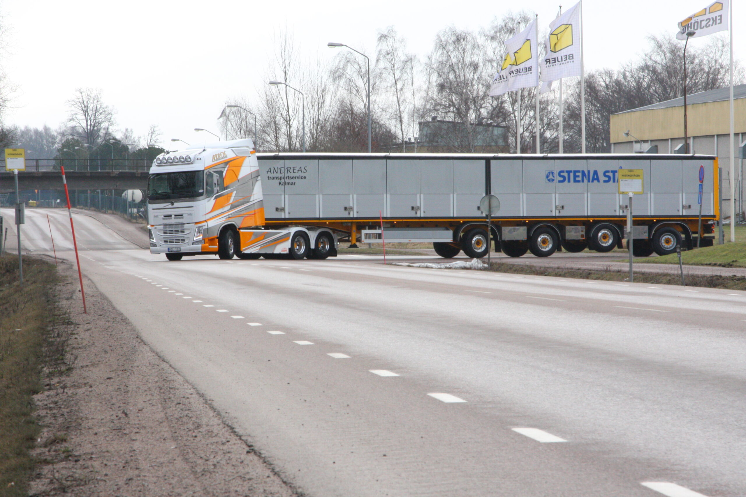 In Zweden rijden er opleggers tot 19 meter lengte. Deze vier-assige oplegger van Andreas Hjorthejm is 18,35 meter lang en heeft de achterste as ver naar achteren staan.