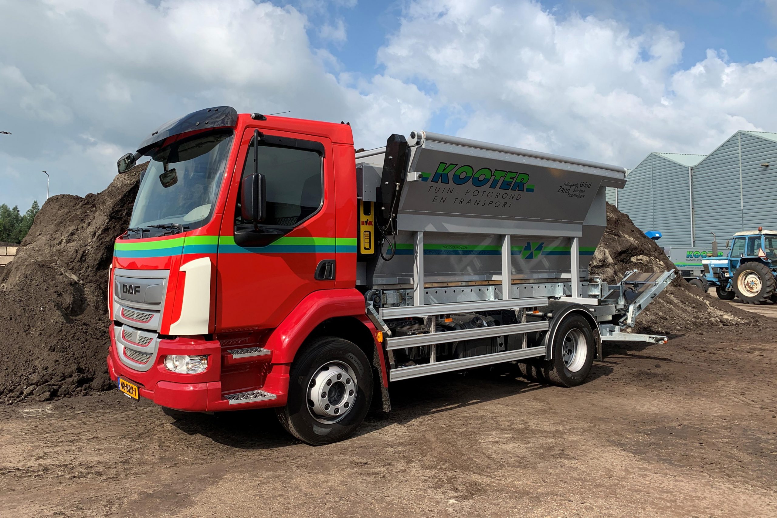 Kooter Transport B.V. levert tuinaarde en potgrond aan kwekers, hoveniers en particulieren. Dat betekent aflevering op de meeste uiteenlopende adressen, soms met smalle toegangspaden. Dus de wendbare DAF LF met de slimme opbouw is dan een uitkomst.  Kooter: “Andere handige zaken zijn de automatische afdeknetten en de mogelijkheid om alles dus ook de transportband op afstand radiografisch te besturen.”