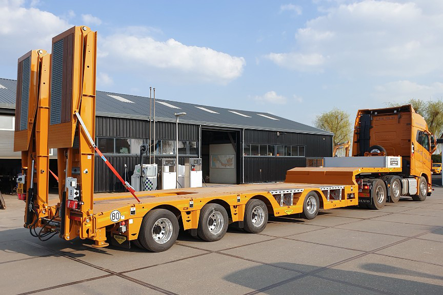 Met deze multifunctionele hydraulisch gestuurde semi dieplader met een brede laadvloer van 2,75m, kunnen ze vrijwel elke soort lading meenemen. De wielkuilen zijn ideaal voor de transport van grondverzetmachines en de gieksluif bied ruimte voor de lange giek van grote rupskranen.