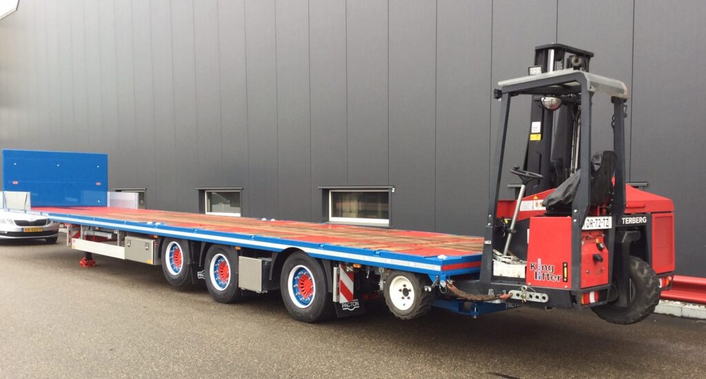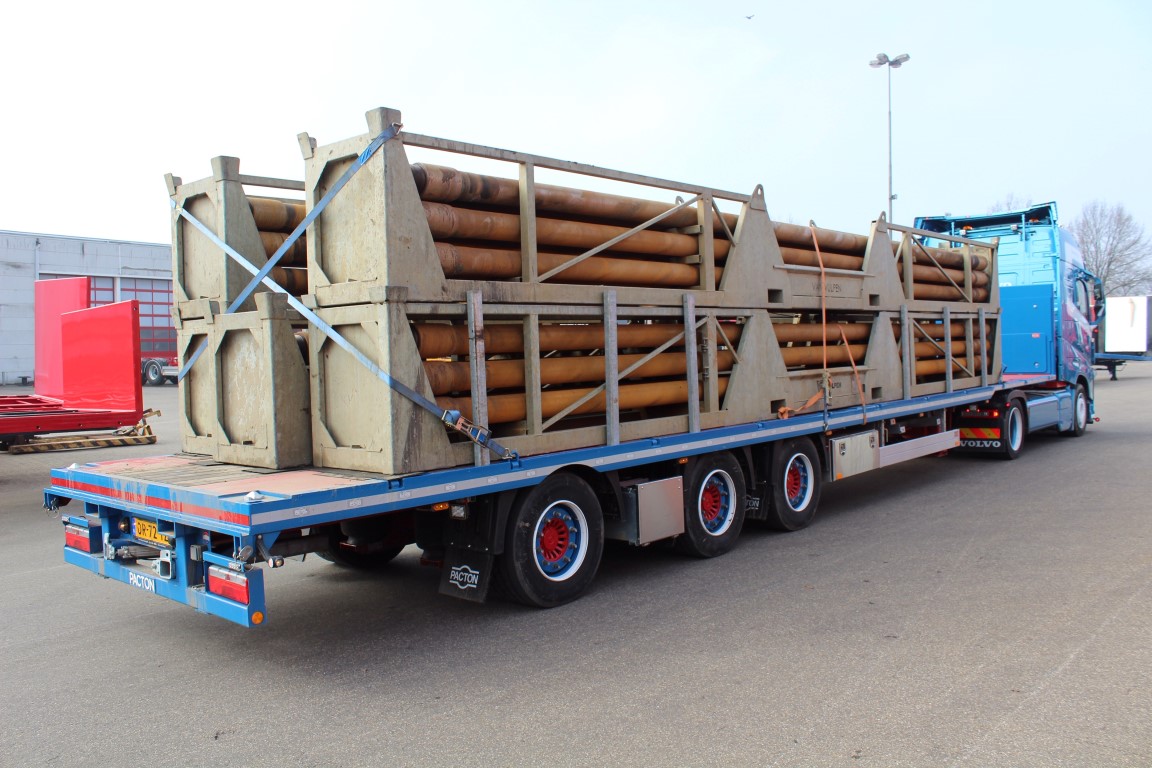 De nieuwe Pacton-oplegger wordt gecombineerd met een Volvo FH4 met 500 pk; een bijzondere en multifunctionele combinatie. Naast de mogelijkheid om efficiënt extra hoge bouwdelen te vervoeren en een meeneemheftruck te koppelen, beschikt de Pacton-oplegger over twistlockaansluitingen voor twee twintig voets en één 40 voets container. Naast een tweetal ruime rvs-kisten – links en rechts – is tussen as 2 en 3 een wagenbrede opbergkist gemonteerd. Voor ladingindeling en -zekering bevinden zich in de trailerrand in totaal 26 rongkokers en ook overdwars in de hardhouten vloer zijn vier rongenrijen geplaatst. In de rand zijn 22 klapbare zeventons bindogen geïntegreerd. De oplegger heeft voorts onder meer in de wielbasis steunen voor het opbergen van oprijrampen en vier breedteborden met verlichting.