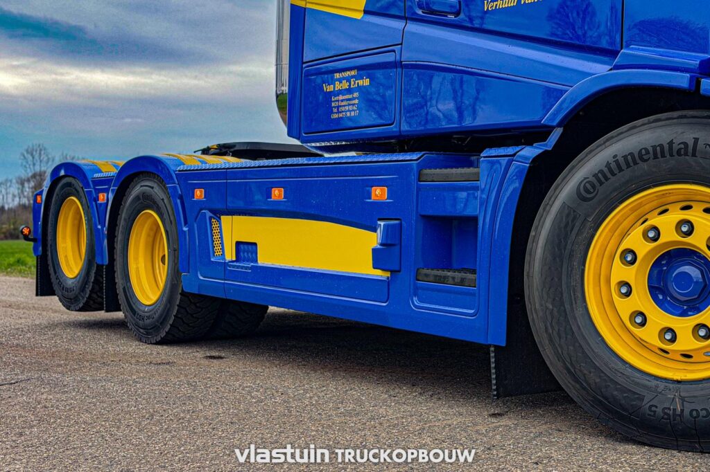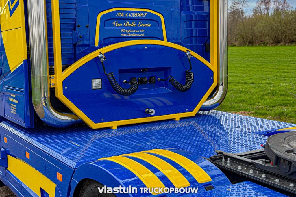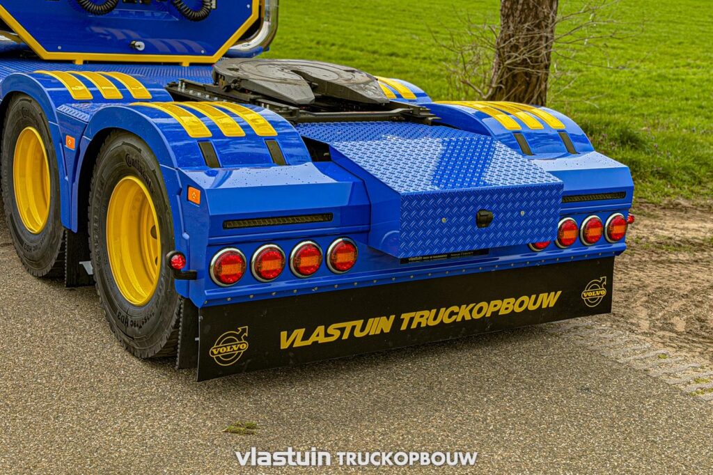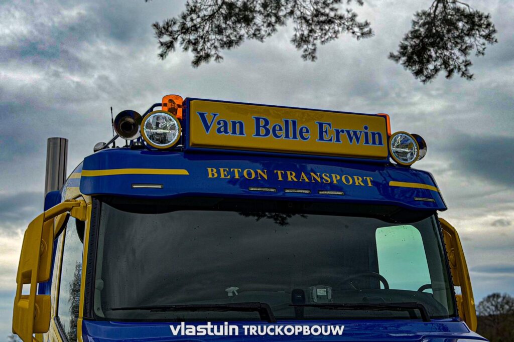 Niet alleen de vorm is opvallend, maar ook zijn blauw-gele kleurstelling. Op het lage dak zijn een rek, lichtbak, luchthoorns, zwaailampen en verstralers gemonteerd. Achter de cabine vinden we staande uitlaten en een breed slangenrek. Verder naar achteren zien we een vlonder van traanplaat, stringetjes tussen de achterwielen en een custom achterbumper.