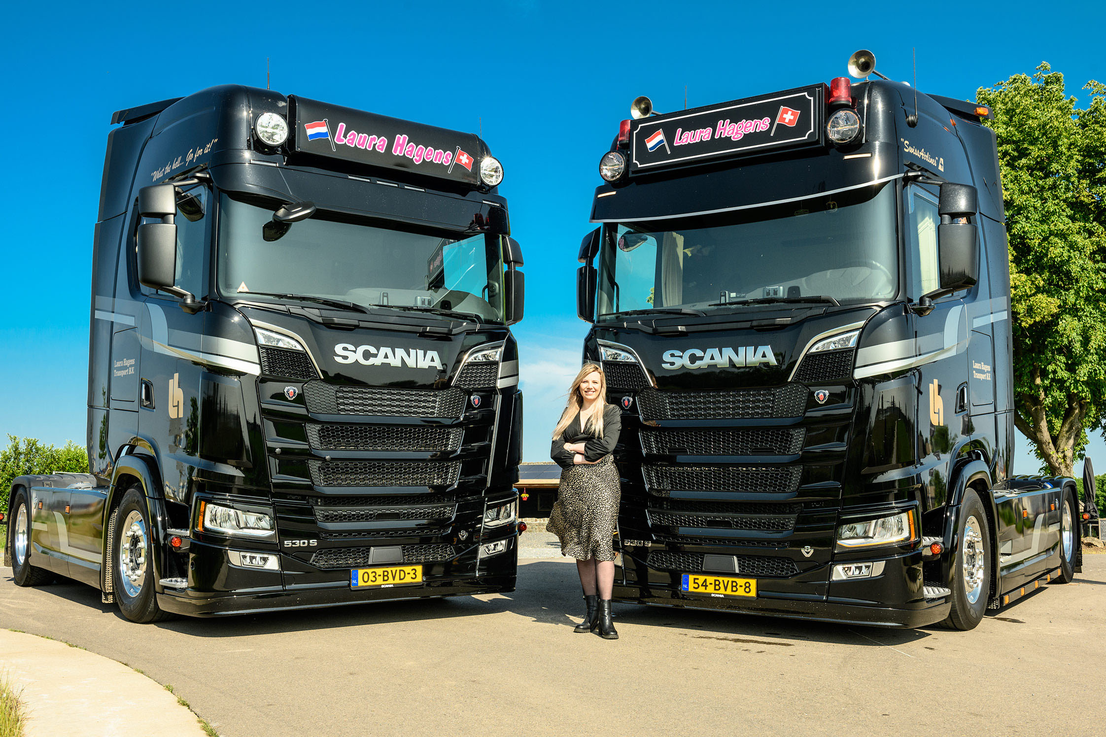 “Hoewel de belettering in vrijwel dezelfde stijl als die van mijn vader is, gaat het wel degelijk om mijn eigen bedrijf”, vertelt Laura Hagens, dochter van Zwitserlandspecialist Ruud Hagens van Datrans BV uit Wanssum. “Ik reed al voor mijn vader en begon in 2017 voor mijzelf met een trekker. Inmiddels heb ik al het losgestort transport van Datrans overgenomen. Als hopelijk in oktober de laatste auto is uitgeleverd, heb ik er dan 20 waarvan het merendeel Scania.
