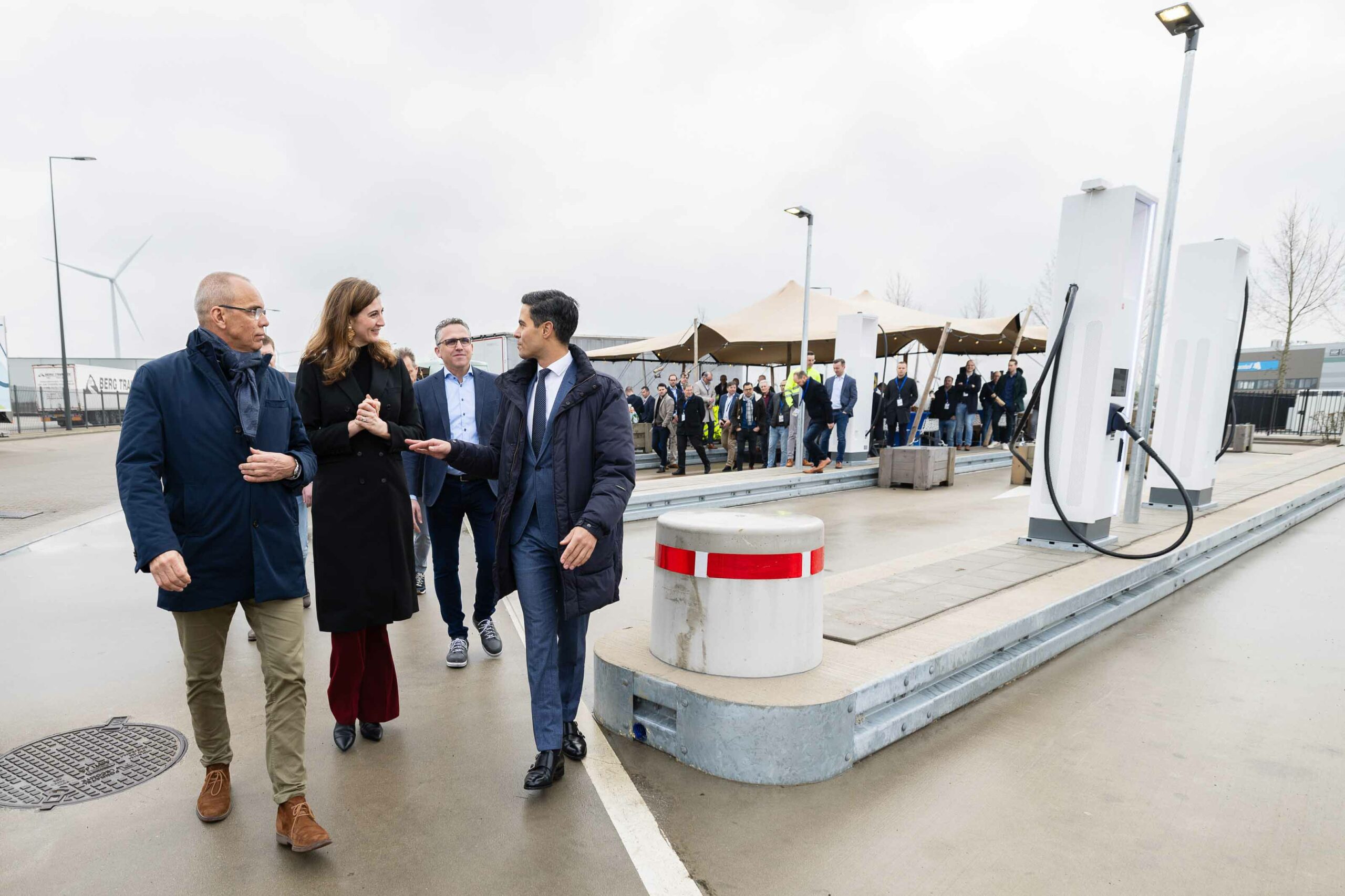 Onlangs heeft demissionair minister van Klimaat en Energie Rob Jetten het snellaadplein voor vrachtwagens op het distributiecentrum van Lidl in Oosterhout geopend.