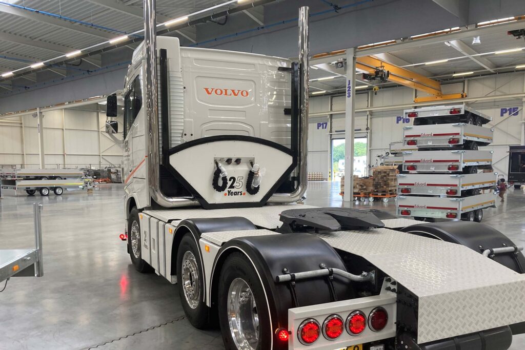 De jubileumtruck is echt het paradepaardje van het wagenpark. “Hij is helemaal gepimpt, oldskool stijl. Hij is voorzien van een speciaal interieur, alcoa velgen, traanplaat, speciale verlichting en twee ‘schoorstenen’,” aldus Marc. Chauffeur Stephan Soetens die vast op de truck gaat rijden, kijkt er al een jaar naar uit en heeft zelf mee mogen denken over de opties en styling van de truck. “Dat mocht wat kosten, daar hebben we 25 jaar hard voor gewerkt. En… ik ga deze nooit meer verkopen,” zegt Marc. De truck wordt ingezet voor binnenlandse ritten voor Sonac. De nieuwe Volvo truck is voorzien van een 500 pk motor met Turbo Compound en is inmiddels de twintigste Volvo truck voor het bedrijf.