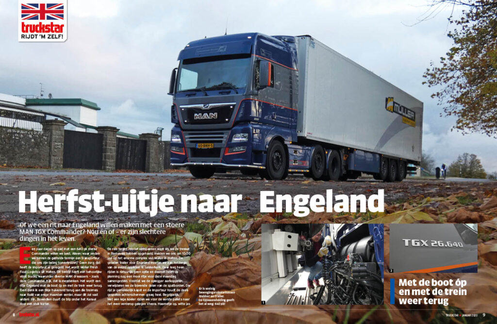 Een paar dagen op pad met een 640 pk Commander willen we best. En een transporteur die ons zijn lading toevertrouwt blijkt ook al door de importeur geregeld. Müller Fresh Food Logistics uit Holten heeft een behoorlijke vloot trucks, waaronder diverse MAN drieassers – zoals de Commander waarmee wij een ritje Engeland met de boot óp en met de trein weer terug zullen maken.