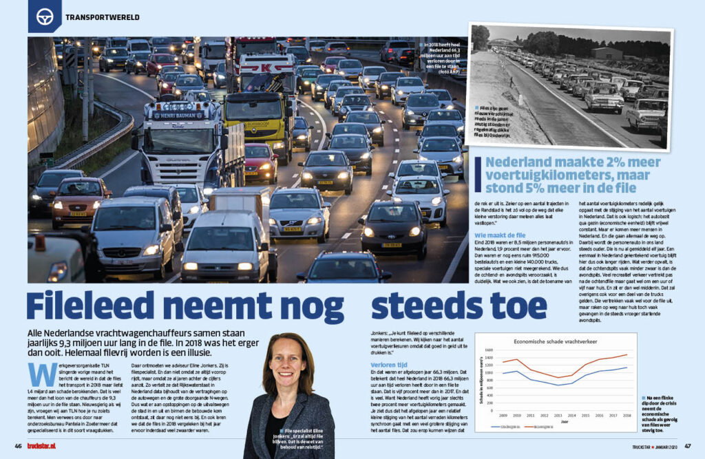 Alle Nederlandse vrachtwagenchauffeurs samen staan jaarlijks 9,3 miljoen uur lang in de file. In 2018 was het erger dan ooit. TLN slingerde vorige maand het bericht de wereld in dat de files het transport in 2018 maar liefst 1,4 miljard aan schade berokkenden. Veel meer dan het loon van de chauffeurs die 9,3 miljoen uur in de file staan. Nieuwsgierig als wij zijn, vroegen wij aan TLN hoe die nu zoiets berekent.