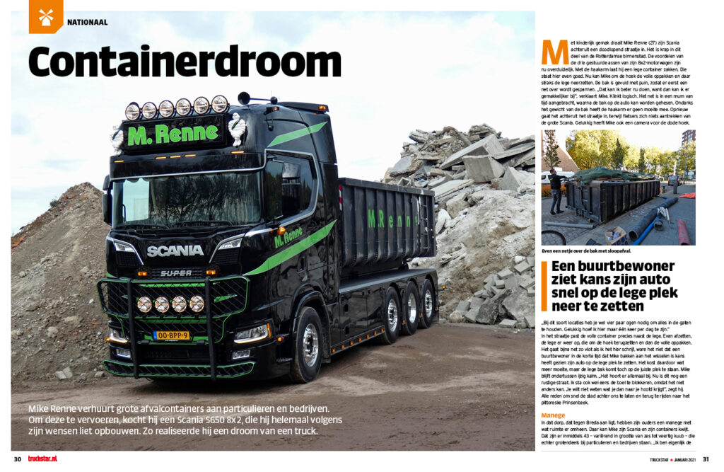 Mike Renne verhuurt afvalcontainers aan particulieren en bedrijven. Om deze te vervoeren, kocht hij een Scania S650 8×2, die hij helemaal volgens zijn wensen liet opbouwen. Het resultaat mag er zijn, zoals de drie gestuurde assen van zijn 8×2-motorwagen. De voordelen daarvan zijn overduidelijk wanneer Mike met gemak zijn Scania achteruit een doodlopend straatje indraait. Met de haakarm laat hij een lege container zakken. Die staat hier even goed. Nu kan hij om de hoek de volle oppakken en daar straks de lege neerzetten.
