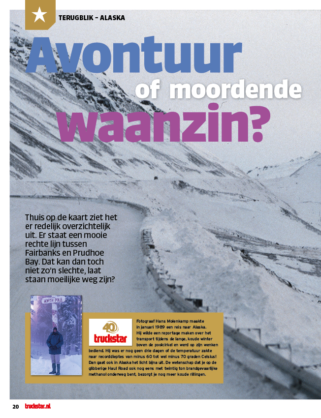 Of het ooit weer zo koud wordt in Alaska als in januari 1989, dat valt te betwijfelen. Daarom blikken we in dit nummer terug op de reis die Hans Molenkamp dat jaar naar Alaska maakte. Hij wilde een reportage maken over het transport tijdens de lange, koude winter boven de poolcirkel en werd op zijn wenken bediend. Hij was er nog geen drie dagen of de temperatuur zakte naar recorddieptes van minus 60 tot wel minus 70 graden Celsius! Dan gaat ook in Alaska het licht bijna uit.