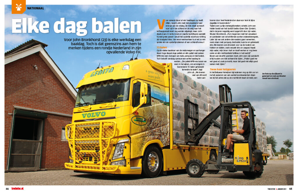 Het eerste wat in je opkomt als je elke dag baalt is: ‘snel ander werk zoeken’. Maar bij John Bronkhorst ligt dat toch anders. Ook al is bij hem elke werkdag een baaldag. Hoe dat zit merken we tijdens een rondje Nederland in zijn opvallende Volvo FH. Dat rondje begint al goed voor iemand die er al vier baaldagen op heeft zitten. De klok staat op kwart voor vijf wanneer hij met grote passen vanuit het ouderlijk woonhuis richting zijn knalgele Volvo wandelt. Van woon-werkverkeer is al net zo min sprake als van opstartproblemen of een ochtendhumeur!