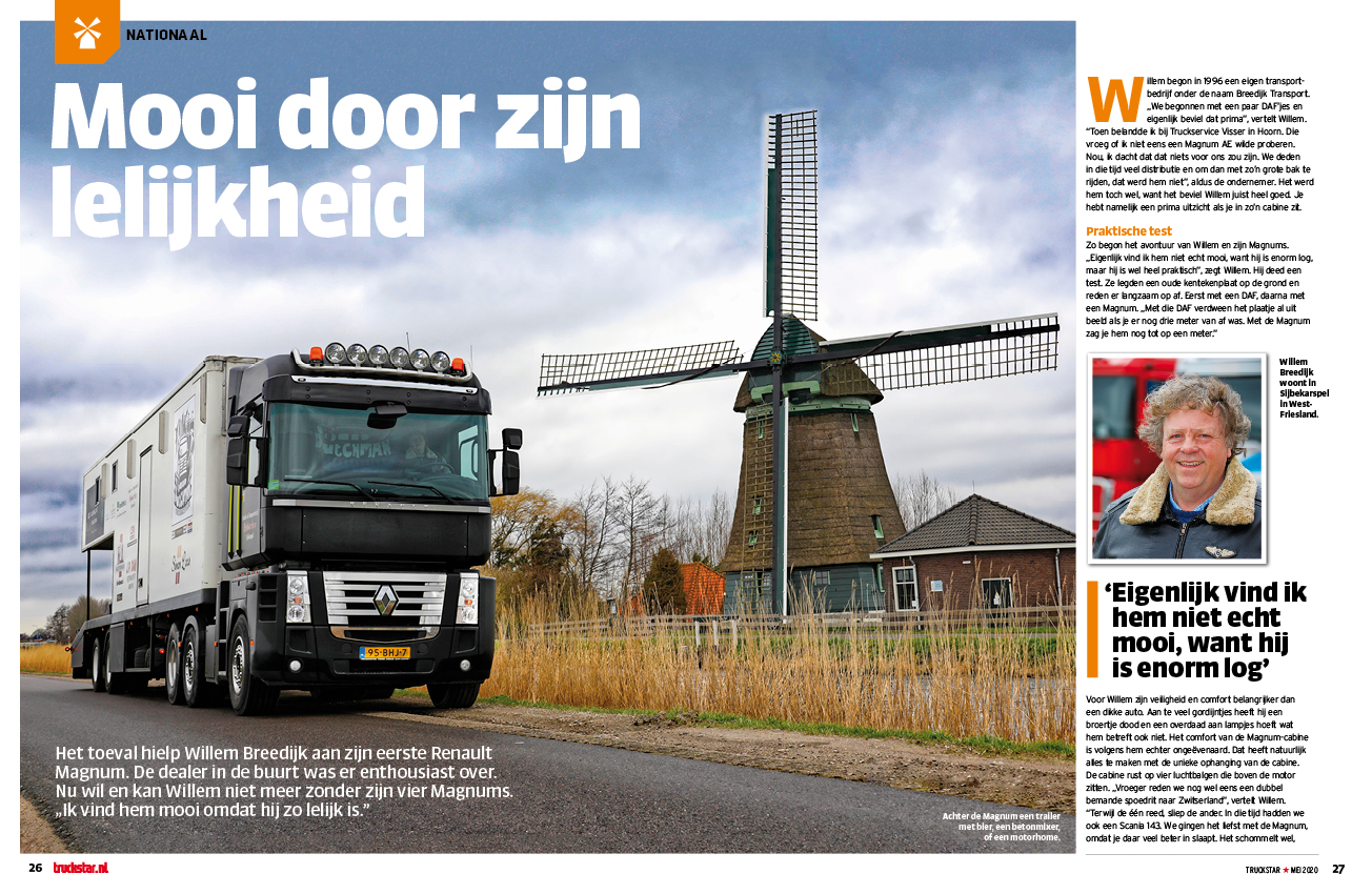 Het toeval hielp Willem Breedijk aan zijn eerste Renault Magnum. ,,Ik dacht dat zo’n Magnum niets voor ons zou zijn. We deden in die tijd veel distributie en om dan met zo’n grote bak te rijden, dat werd hem niet”.  Maar het werd hem toch wel, want het beviel Willem juist heel goed. Hij deed een test. Ze legden een oude kentekenplaat op de grond en reden er langzaam op af. Eerst met een DAF, daarna met een Magnum. „Met die DAF verdween het plaatje al uit beeld als je er nog drie meter van af was. Met de Magnum zag je hem nog tot op een meter.” Zo begon het avontuur van Willem en zijn Magnums.