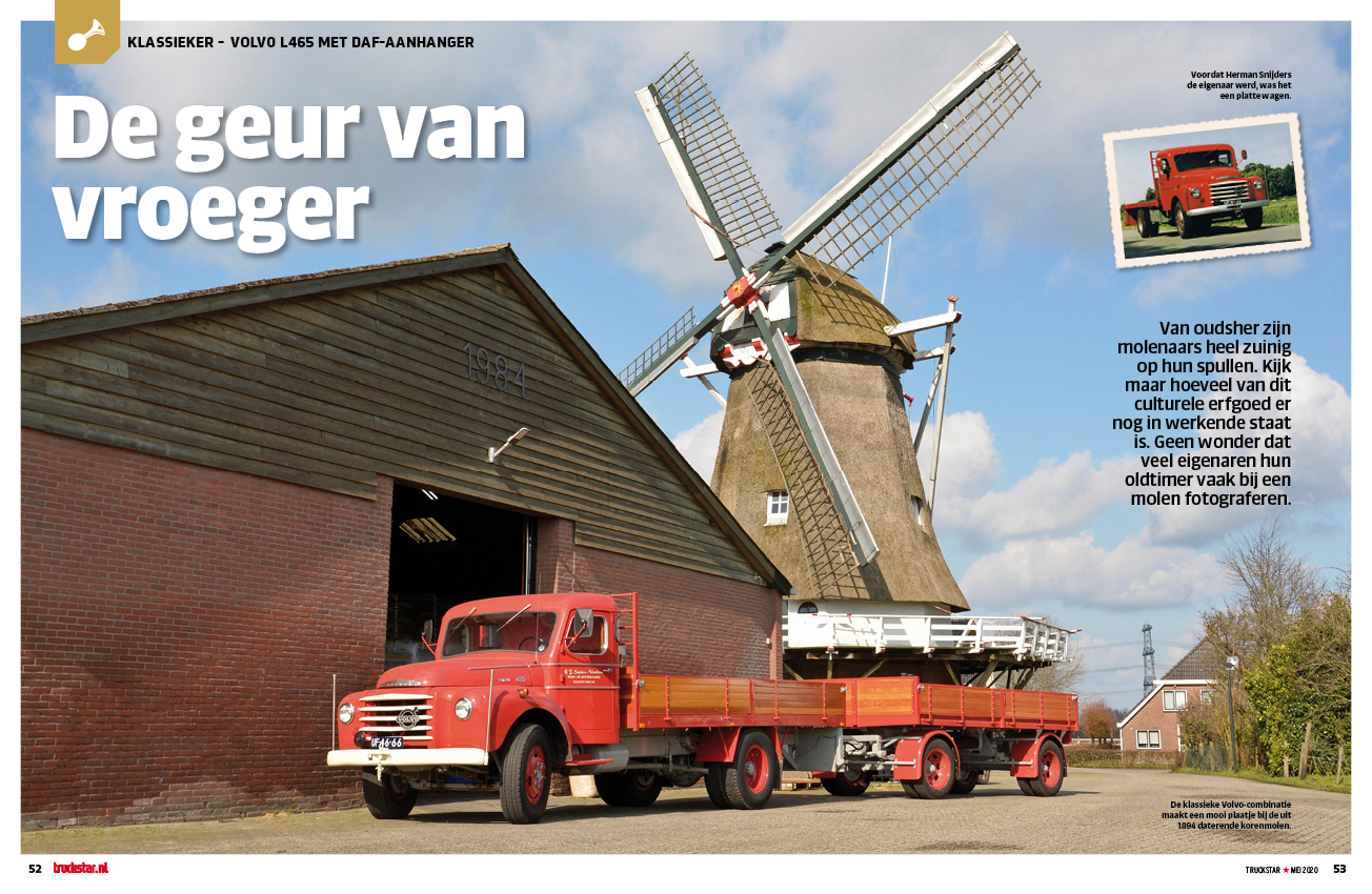 De prachtig gerestaureerde Volvo L465 uit 1963 met DAF-aanhanger van Herman Snijders maakt het perfecte plaatje bij korenmolen De Hoop. Het uit 1894 daterende monument, maakt deel uit van familiebedrijf Snijders Wachtum, dat zich bezighoudt met de handel in mengvoeders, kunstmest, zaaizaad en andere producten voor de boer. De transporttaken worden uitgevoerd met vier keurig opgebouwde Volvo FM-trekkers. Maar de Volvo-klassieker is er voor de plezierritjes.