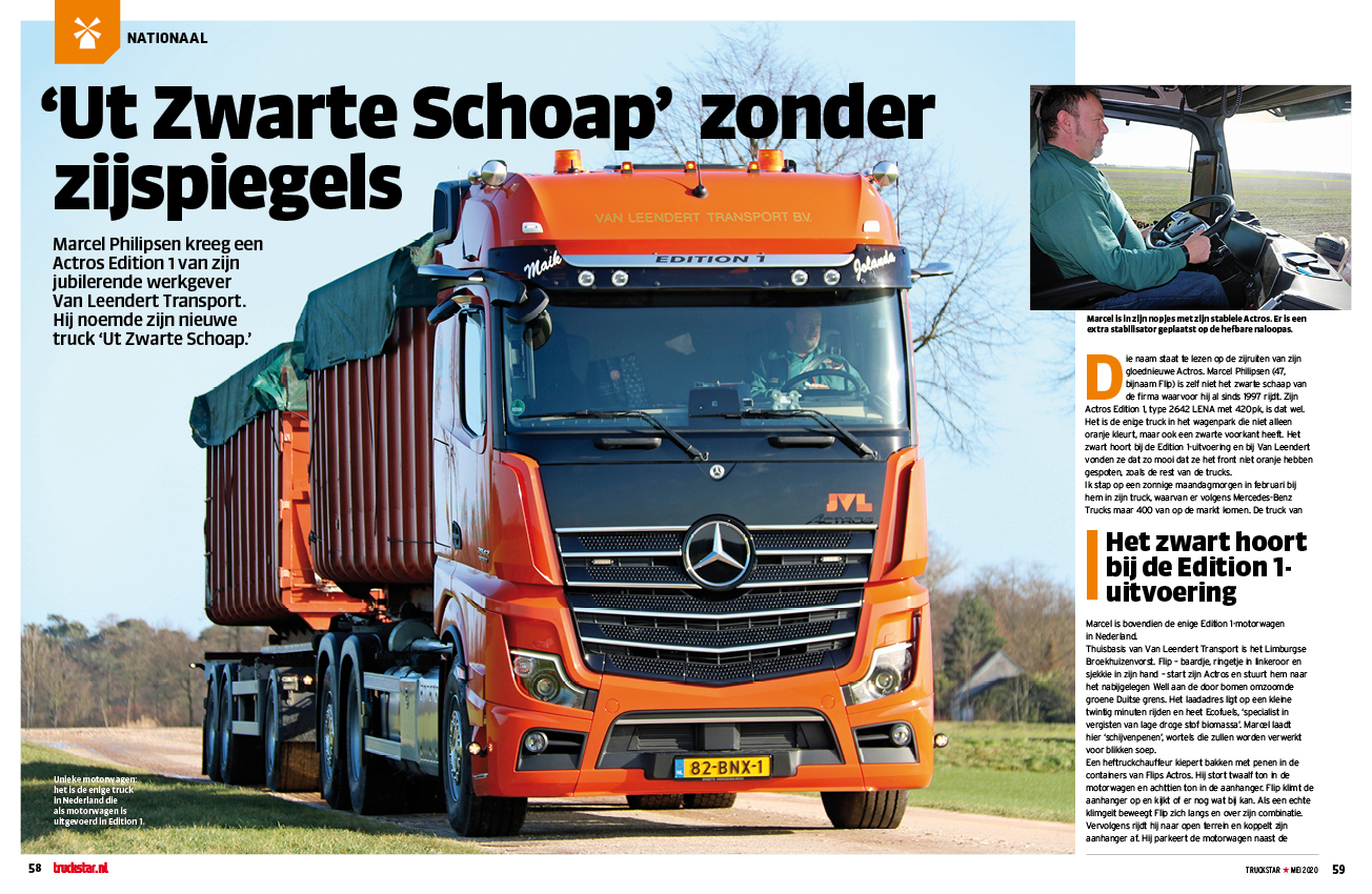 Marcel Philipsen kreeg een Actros Edition 1 van zijn jubilerende werkgever Van Leendert Transport. Hij noemde zijn nieuwe truck ‘Ut Zwarte Schoap.’ Die bijnaam slaat op de truck zelf. De Actros Edition 1, type 2642 LENA met 420 pk is namelijk de enige truck in het wagenpark die niet alleen oranje kleurt, maar ook een zwarte voorkant heeft. Het zwart hoort bij de Edition 1-uitvoering en bij Van Leendert vonden ze dat zo mooi dat ze het front niet oranje hebben gespoten, zoals de rest van de trucks. Overigens is dat niet het enige wat hem tot buitenbeentje maakt. De motorwagen van Marcel is ook nog eens de eerste Edition 1-motorwagen in Nederland.