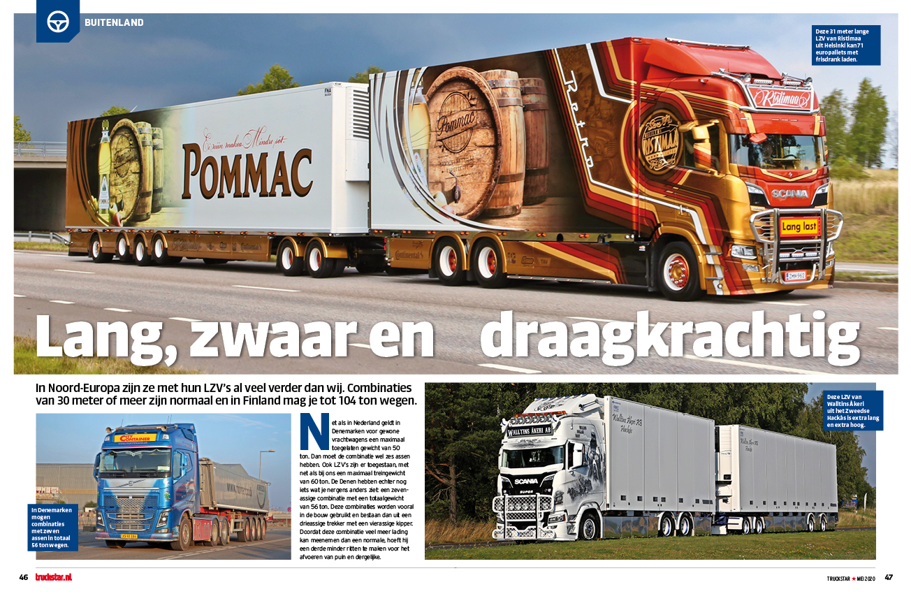 In Noord-Europa zijn ze met hun LZV’s al veel verder dan wij. Combinaties van 30 meter of meer zijn normaal. Zo hebben de Denen iets wat je nergens anders ziet: zevenassige combinaties van 56 ton die vooral in de bouw worden gebruikt en uit een drieassige trekker met een vierassige kipper bestaan. In de Finse bossen kun je zelfs road-trains tegenkomen met een trekker, twee opleggers en een wipkar. Maar wat ze allemaal gemeen hebben: ze zijn stuk voor stuk bloedmooi.