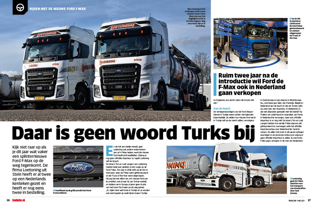 Toen twee jaar geleden de Ford F-Max op de IAA in Hannover werd geïntroduceerd en meteen tot Truck of the Year werd uitgeroepen, zagen de broers Ton en Loet Langen van Loetoning het wel zitten om zo’n nieuwe Ford aan te schaffen. Ook al was hij van Turkse makelij en hebben we in Europa al jaren geen trucks van het merk Ford meer op de weg gehad. „Er rijden heel wat Fords in Turkije en ze worden ook veel ingezet op vaste lijnen tussen Turkije en Engeland, dus slecht kunnen die trucks niet zijn.”