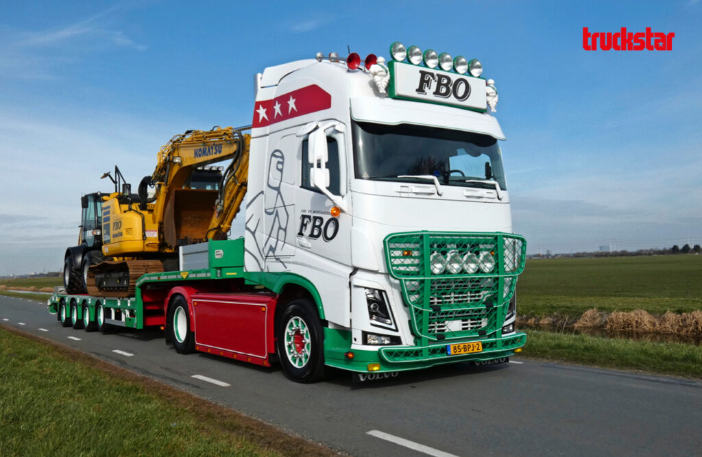 De verse Volvo FH16 van FBO is opnieuw een heuse showtruck geworden, waar echter gewoon mee wordt gewerkt. Dat blijkt wel uit de eveneens nieuwe vierassige Broshuis-semi-dieplader die er sinds kort achter hangt. Nu het span compleet is, mochten we er een reportage over maken. ,,Als je iets wilt weten, bel je maar met Sem de Wilde van Semtrade’’, zegt eigenaar Frans Olierook. Sem, als hij dit hoort: „Ja, Frans treedt niet graag op de voorgrond. De opdracht was dat hij een nieuwe Volvo FH wilde, want die vond hij wel heel mooi. En hij moest dik. Hoe en door wie, dat moest ik maar uitzoeken.” Gelukkig had Sem een voorbeeld, want bij FBO hebben ze al eerder een Volvo, een FH16, laten opbouwen.