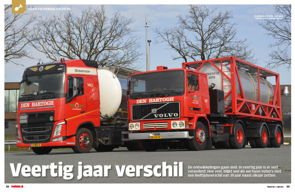 Het bouwjaar 1981 is de F12 beslist niet aan te zien. De Volvo van Den Hartogh glimt ondanks zijn leeftijd van 39 jaar alsof hij net is afgeleverd. Toch heeft hij er een lang en dienstbaar leven bij de firma uit Rozenburg op zitten, waarin er meer dan een miljoen kilometer onder de wielen door rolden. Het vormt een mooie tegenstelling met de moderne FH, die dagelijks zijn kilometers maakt in het tanktransport. Deze Volvo oogt weliswaar ook nog keurig, maar je kunt wel zien dat er gewoon mee wordt gewerkt. Als je ze zo naast elkaar ziet, lijkt de generatiekloof niet eens zo groot.