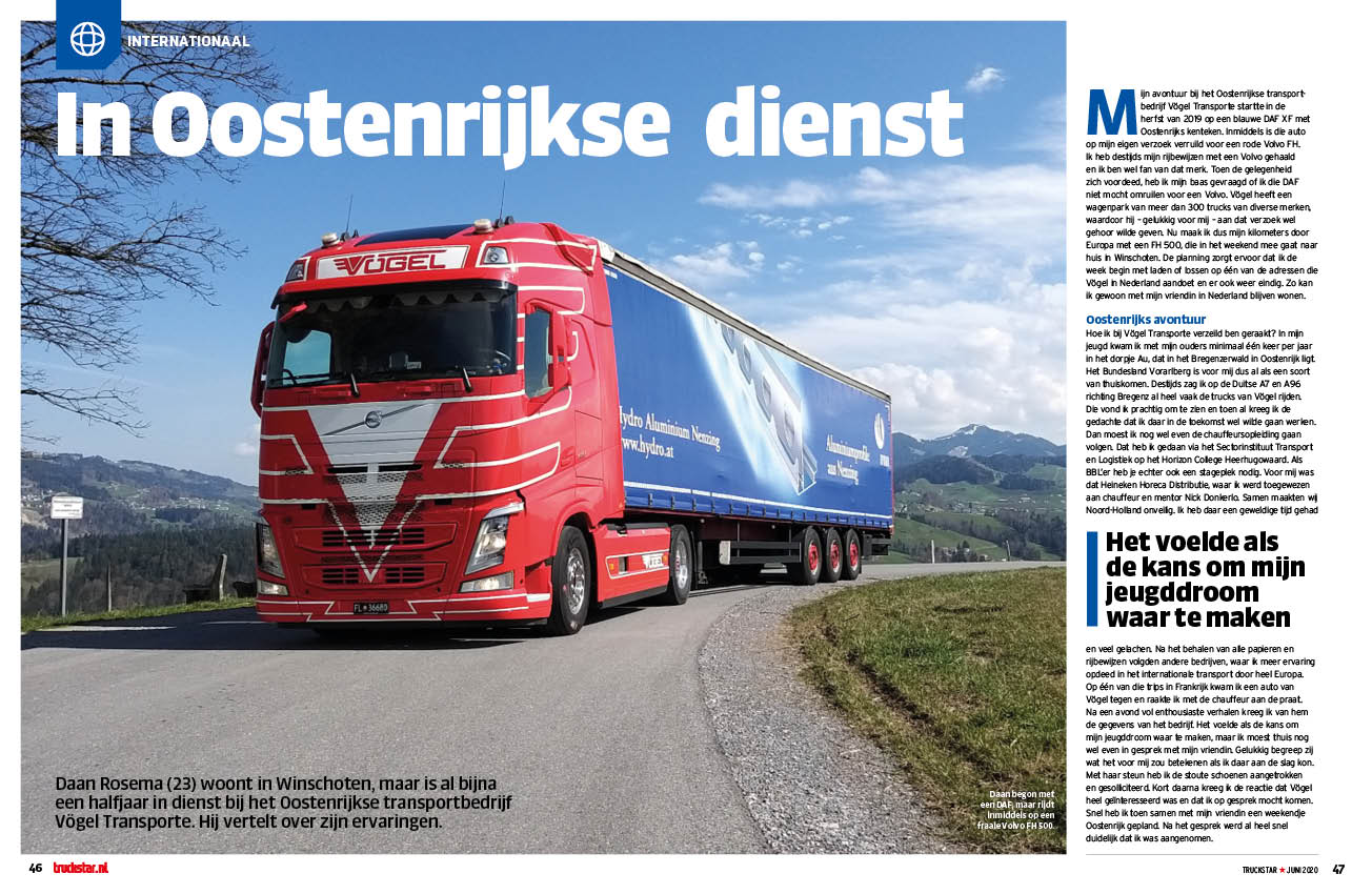 Daan Rosema woont in Winschoten, maar is al bijna een halfjaar in dienst bij het Oostenrijkse transportbedrijf Vögel Transporte. Hij vertelt over zijn ervaringen. ,,In mijn jeugd kwam ik met mijn ouders minimaal één keer per jaar in het dorpje Au in Oostenrijk en zag ik richting Bregenz al heel vaak de trucks van Vögel rijden. Die vond ik prachtig om te zien en toen al kreeg ik de gedachte dat ik daar in de toekomst wel wilde gaan werken’’.