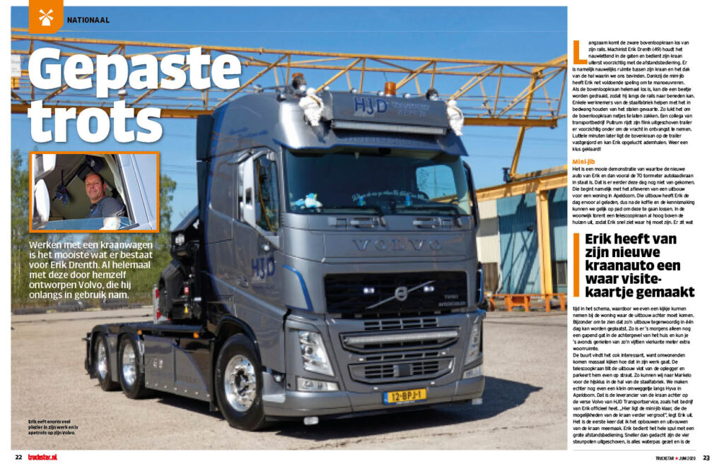 Werken met een kraanwagen is het mooiste wat er bestaat voor Erik Drenth. Al helemaal met deze door hemzelf ontworpen Volvo, die hij onlangs in gebruik nam. „Ik wilde een 6×2 met gestuurde naloopas, een tientons vooras en rondom luchtvering. Volvo was de enige die dat af fabriek kon leveren. En die Volvo Dynamic Steering is ook fijn in dit werk.” Voor de kraan werd gekozen voor een exemplaar van 70 tonmeter. „Daarmee kan ik heel veel. Bovendien heb ik een giek van twintig meter, zodat ik zelfs achter de oplegger bijvoorbeeld nog een lege container kan oppakken”, legt Erik uit. Van planning tot realisatie duurde bijna een jaar, maar inmiddels is Erik alweer twee maanden met zijn nieuwe kindje aan het werk.