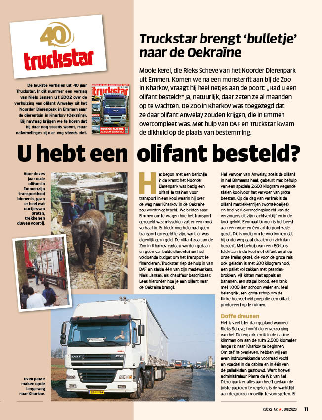 Het begon in 2002 met een berichtje in de krant: het Noorder Dierenpark was bezig een olifant te trainen voor transport in een kooi waarin hij over de weg naar Kharkov in de Oekraïne zou worden gebracht. We belden naar Emmen om te vragen hoe het transport geregeld was: misschien zat er een mooi verhaal in. Er bleek nog helemaal geen transport geregeld te zijn, want er was eigenlijk geen geld. De olifant zou aan de Zoo in Kharkov cadeau worden gedaan en geen van beide dierentuinen had voldoende budget om het transport te financieren. Met hulp van DAF en Truckstar kwam de dikhuid op de plaats van bestemming.