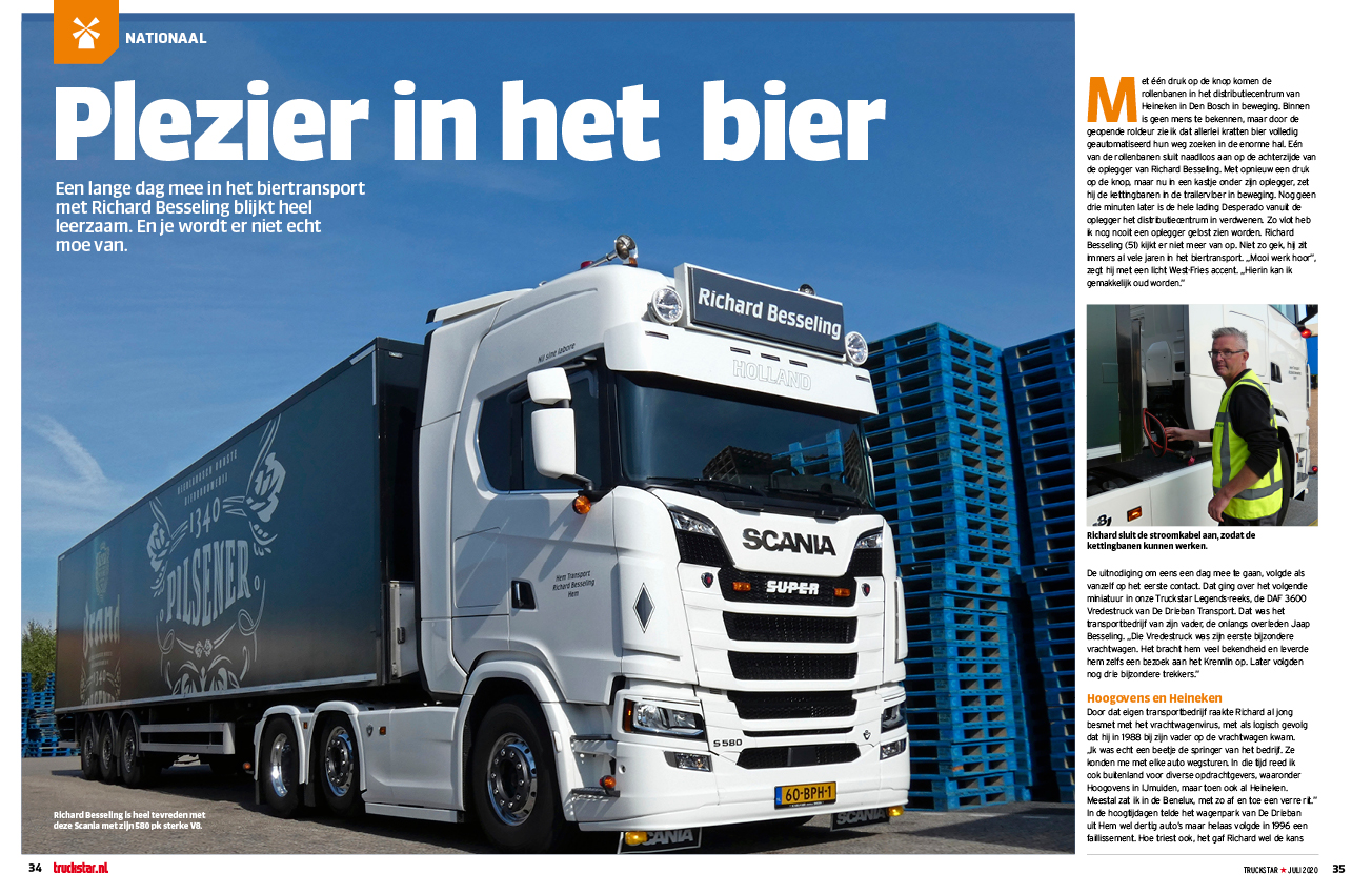 Ons eerste contact met Richard Besseling ging over het volgende miniatuur in onze Truckstar Legends-reeks, de DAF 3600 Vredestruck van De Drieban Transport. Dit bedrijf is opgericht door Richards vader, Jaap Besseling, die onlangs is overleden. „Die Vredestruck was zijn eerste bijzondere vrachtwagen. Het bracht hem veel bekendheid en leverde hem zelfs een bezoek aan het Kremlin op.” De uitnodiging om eens een dag mee te gaan, volgde als vanzelf en werd geaccepteerd. En wat blijkt, een lange dag mee in het biertransport met Richard Besseling is heel leerzaam en je wordt er niet echt moe van.