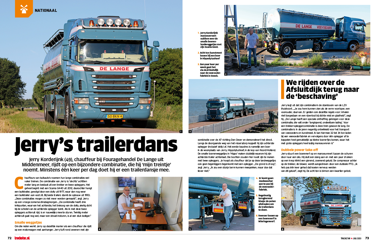 Chauffeurs van bulkauto’s noemen hun lange combinaties ook wel treinen. Zo ook Jerry Korderijnk, chauffeur bij Fouragehandel De Lange. De combinatie van Jerry is ‘slechts’ achttien meter lang en bestaat uit een trekker en twee opleggers. Het geheel begint met een Scania G440 uit 2012, daarachter hangt een bulktrailer, gevolgd door een dolly uit 1977, waar dan nog weer een bulktrailer aan vast zit. En minstens één keer per dag doet hij er een trailerdansje mee. „De combinatie heeft namelijk drie knikpunten, waarvan het achterste, het trekoog van de dolly, akelig dicht bij de schotel van de achterste oplegger komt. Als ik met deze twee opleggers achteruit rijd, is er nauwelijks mee te sturen..”