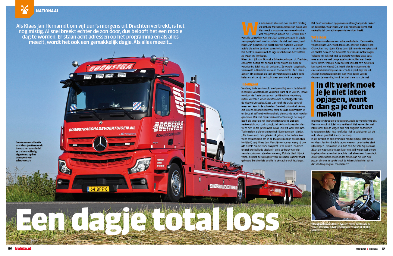 Als Klaas Jan Hernamdt om vijf uur ’s morgens uit Drachten vertrekt, is het nog mistig. Gelukkig breekt al snel de zon door en belooft het een mooie dag te worden. Er staan acht adressen op het programma en als alles meezit, wordt het ook een gemakkelijk dagje. Als alles meezit. „Soms tref je auto’s aan die volledig in elkaar zitten en waarvan je maar liever niet wilt weten wat ermee is gebeurd en soms tref je auto’s met alleen een forse deuk. Als er geen wielen meer onder zitten, kan het een hele puzzel zijn om ze op de truck te krijgen. Misschien zul je dat vandaag nog wel meemaken.”