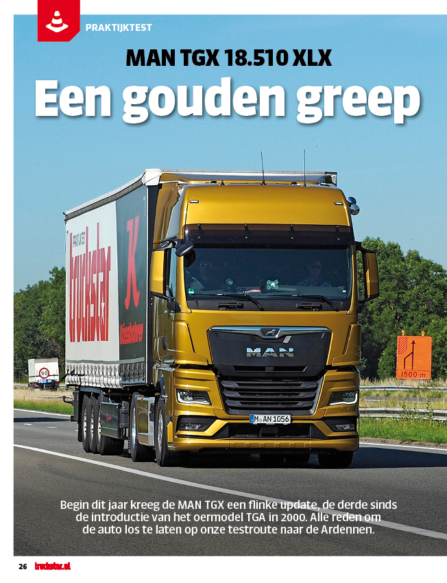 Begin dit jaar kreeg de MAN TGX een flinke update, de derde inmiddels sinds de introductie van het oermodel TGA in 2000. Alle reden om de auto los te laten op onze testroute naar de Ardennen. Met deze derde generatie staat er geen compleet nieuwe truck en ook bij het exterieur moet je goed kijken naar de verschillen, want de nieuwste TGX lijkt toch vooral op de bekende MAN. Veel transportbedrijven vinden een geleidelijke overgang naar een nieuwe look echter wel fijn. Dat maakt de al bestaande vloot niet in één keer zo gedateerd. Die wens is dus vervuld. Wij concluderen over de nieuwe MAN: een gouden greep.