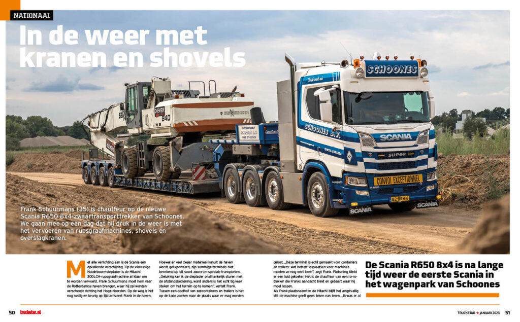 Met alle verlichting aan is de Scania R650 8×4-zwaartransporttrekker van Schoones een opvallende verschijning. Chauffeur op deze truck is Frank Schuurmans, wiens carrière in het transport begon als truckspotter. „Ik heb heel wat kilometers afgelegd om de mooiste trucks te spotten en nu, jaren later, ben ik degene die regelmatig wordt gespot”, zegt hij lachend. Zo ook vandaag. Uit het raam van een passerende bestelbus probeert een jongen met zijn telefoon een foto te maken van het gehele span. Met een big smile en een opgestoken duim rijdt hij verder.