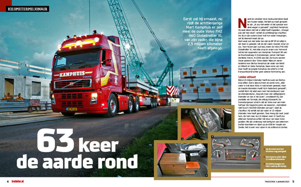 Bijna 2,5 miljoen kilometer heeft de oude van Bertus Kamphuis erop zitten. Dat is bijna 63 keer de aarde rond. „Mijn vader is met deze Volvo in veel landen geweest, maar de meeste kilometers heeft hij in Nederland gemaakt”, vertelt Mart. Hij wijst even naar het dashboard, naar de kilometerstand. „Nog iets meer dan vijftigduizend kilometer en dan is het zover”, constateert hij. Een prestatie van formaat, die ontzag inboezemt. Hij vertelt dat zijn vader er 1,5 miljoen kilometer mee heeft gereden. Toen kreeg zijn neef Joost hem, die hem naar de 2,4 miljoen reed.