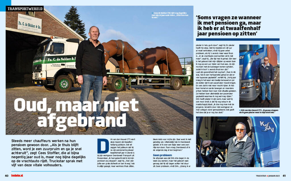Er is nog steeds een groot tekort aan vrachtwagenchauffeurs, dus is het ook niet zo vreemd dat bedrijven er alles aan doen om hun personeel aan zich te binden. Voor sommige chauffeurs is de band met het bedrijf en de truck zo sterk dat ze zelfs na hun pensionering nog door blijven werken. We portretteerden vijf van deze doorwerkers.