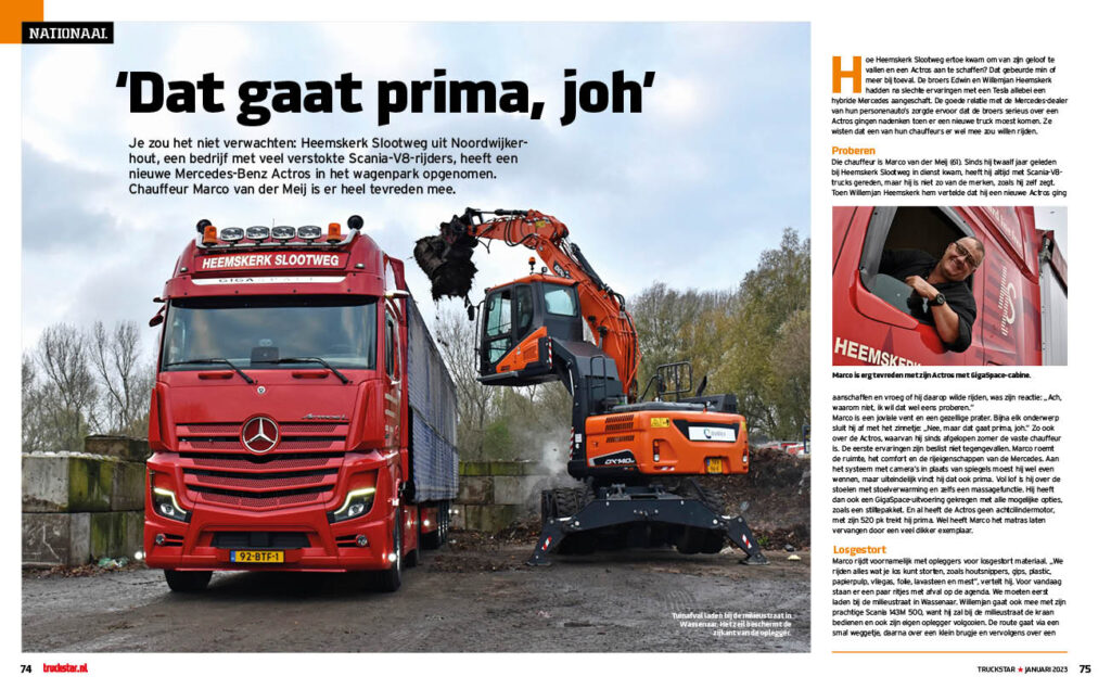 Marco van der Meij (61) heeft sinds hij twaalf jaar geleden bij Heemskerk Slootweg in dienst kwam altijd met Scania-V8-trucks gereden. Toen Willemjan Heemskerk hem vertelde dat hij een nieuwe Actros ging aanschaffen en vroeg of hij daarop wilde rijden, was zijn reactie: „Ach, waarom niet, ik wil dat wel eens proberen.” Nu is hij de vaste chauffeur op de Actros en de eerste ervaringen zijn beslist niet tegengevallen. Marco roemt de ruimte, het comfort en de rijeigenschappen van de Mercedes. Aan het systeem met camera’s in plaats van spiegels moest hij wel even wennen, maar uiteindelijk vindt hij dat ook prima.