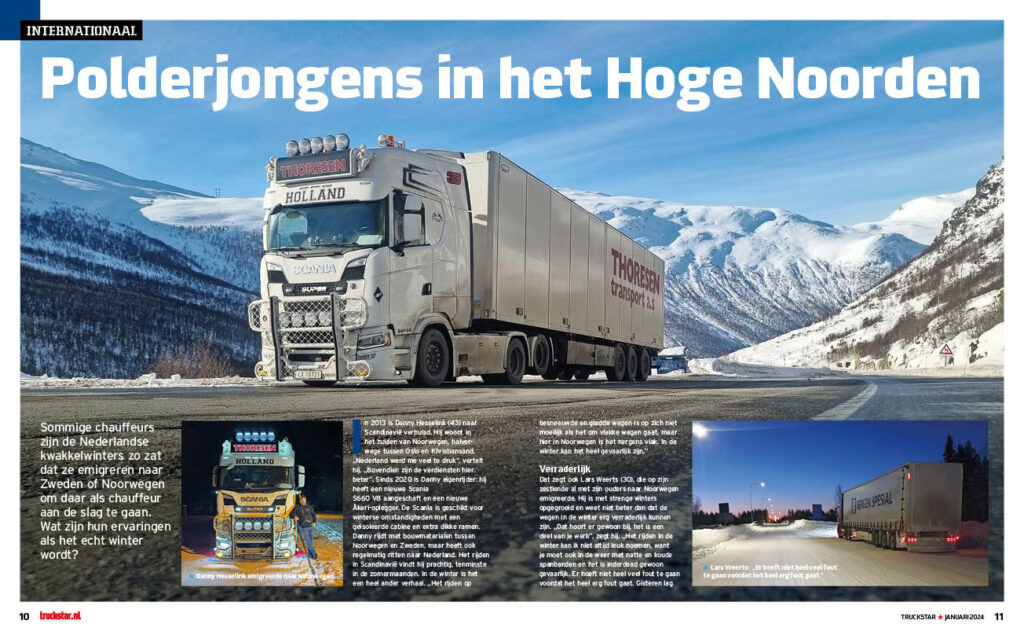 Hoe vergaat het de Nederlandse chauffeurs die ooit ons platte land met kwakkelwinters ingeruild hebben voor Zweden of Noorwegen? Wat zijn hun ervaringen tijdens deze donkere tijd van het jaar, als het echt winter is? Maar liefst tien voormalige ‘polderjongens’ deelden hun belevenissen, foto’s en tips met ons. Zoals Danny Hesselink die sinds 2020 in Noorwegen woont en werkt. „Het rijden op besneeuwde en gladde wegen is op zich niet moeilijk als het om vlakke wegen gaat, maar hier in Noorwegen is het nergens vlak en in de winter kan het heel gevaarlijk zijn.”